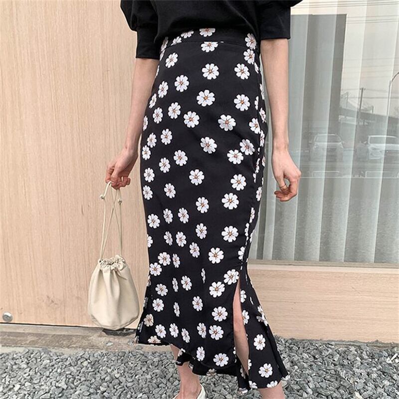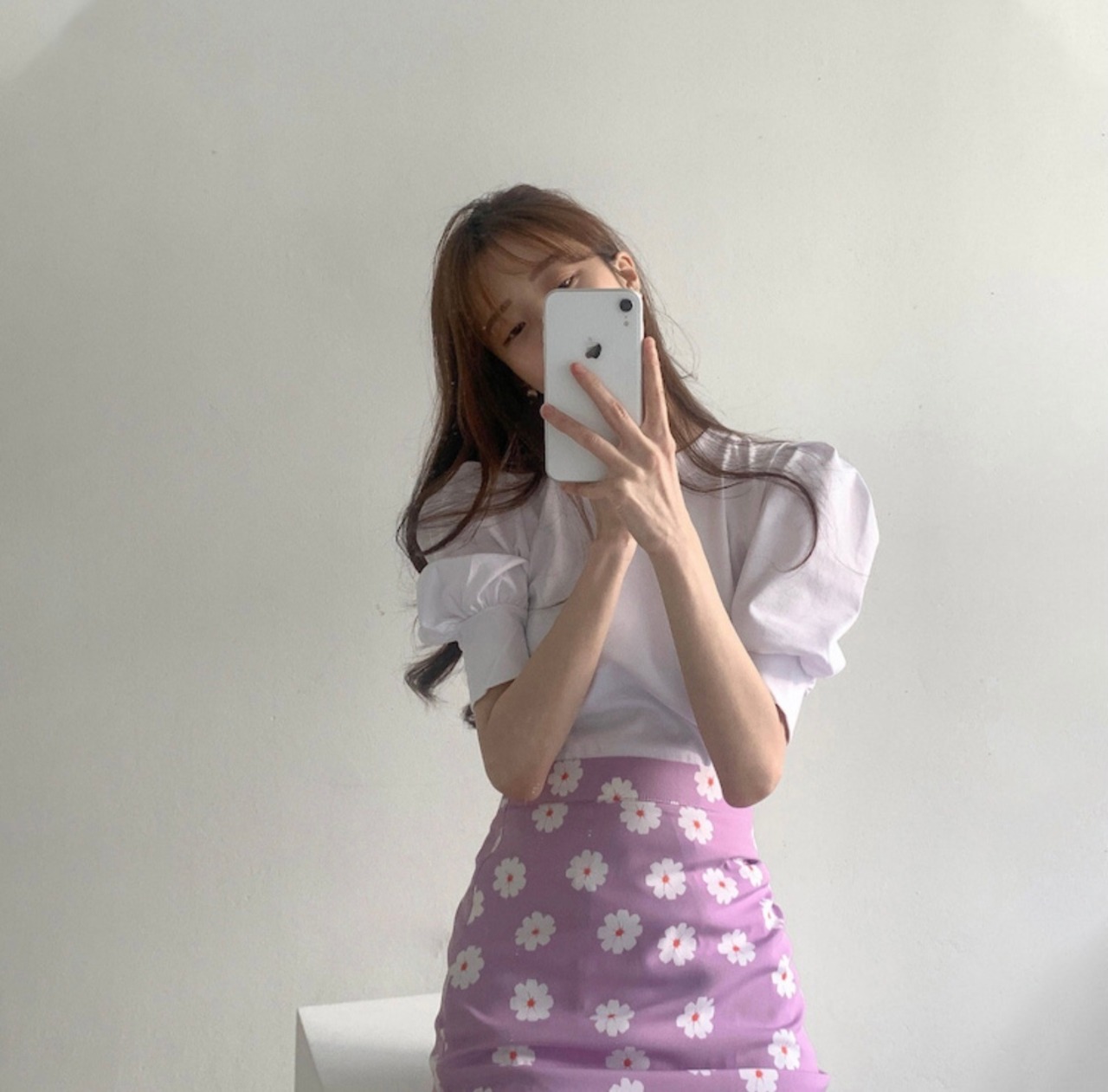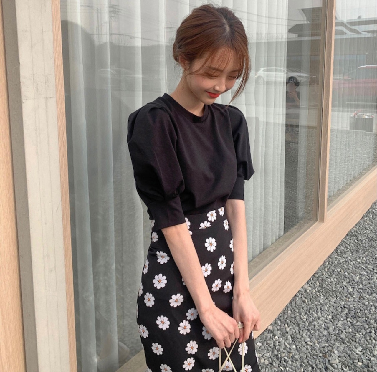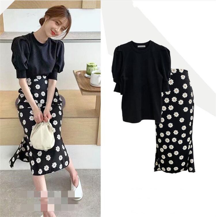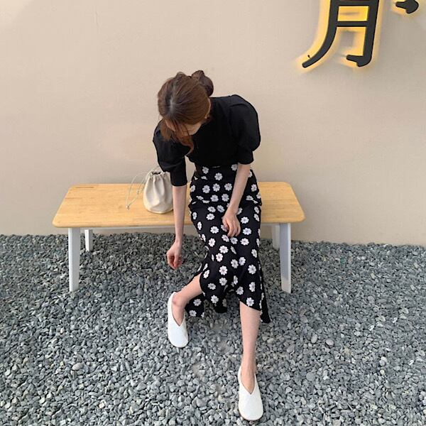 set up | セットアップ パフスリーブ サイドスリット 着痩せ タイトスカート INSスタイル 体型カバー デイジー柄 セットアイテム ハイウエスト 韓国ファッション