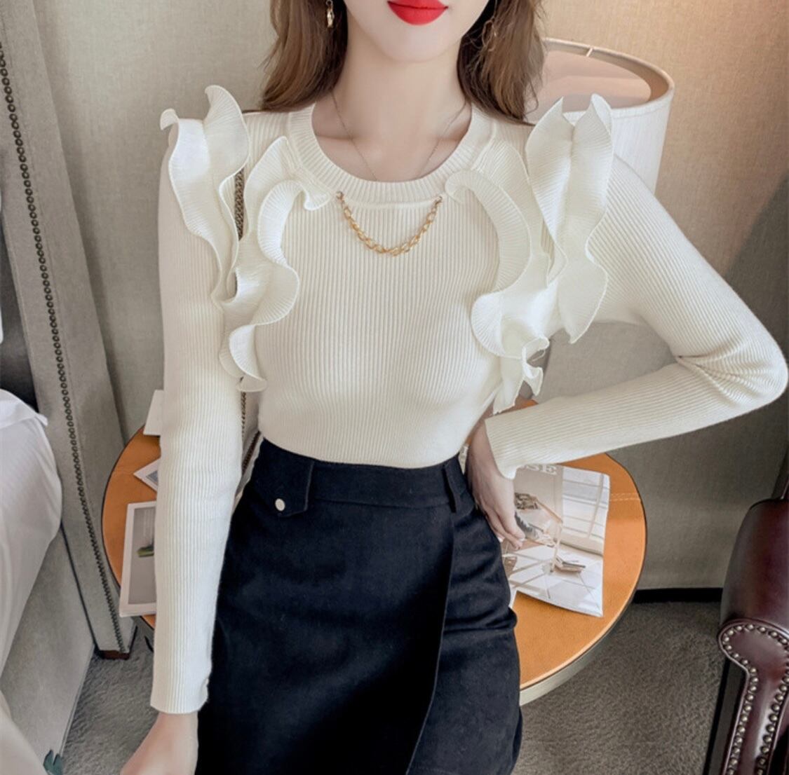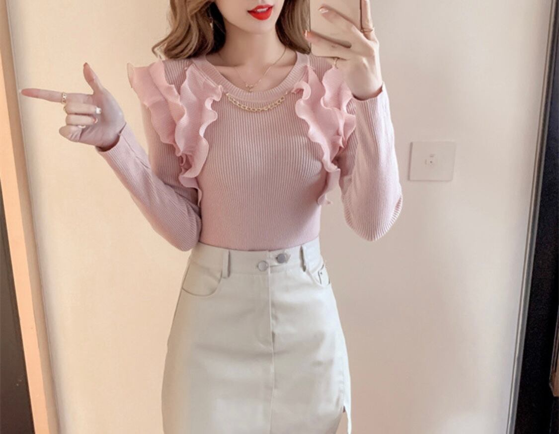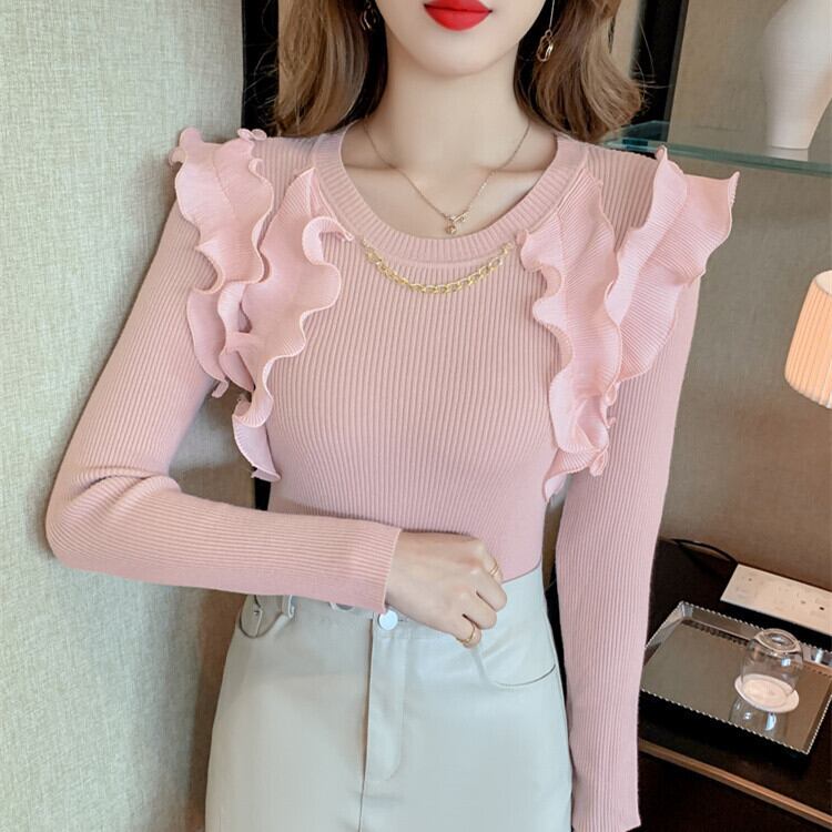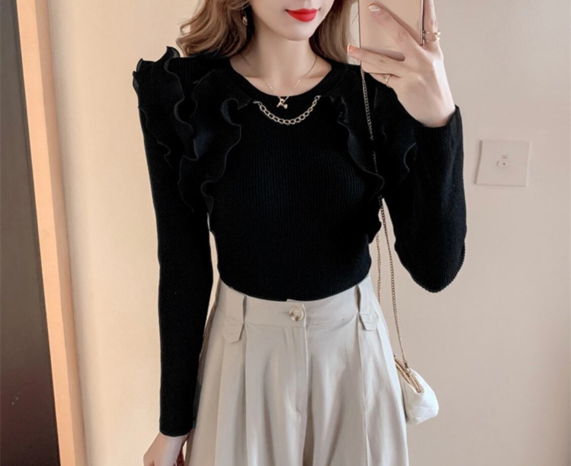 knit | ニット トップス フリル 長袖 スリム チェーンネック付き INSスタイル フェミニン 韓国