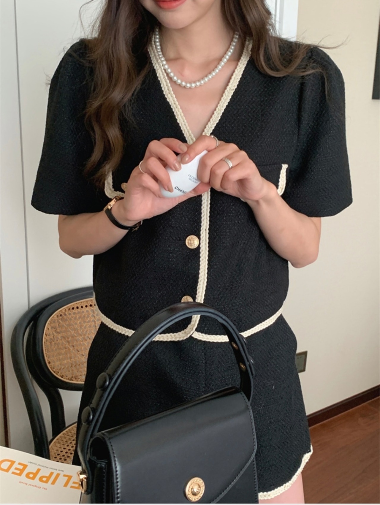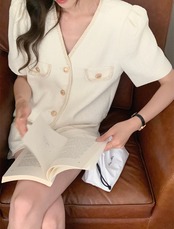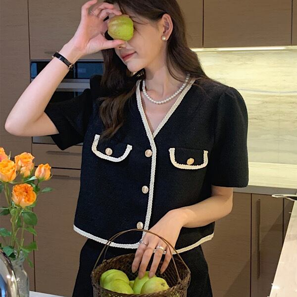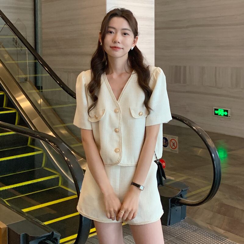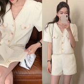 set up | セットアップ Vネックトップス 半袖 ショートパンツ CHIC 着痩せ 体型カバー デート 韓国ファッション
