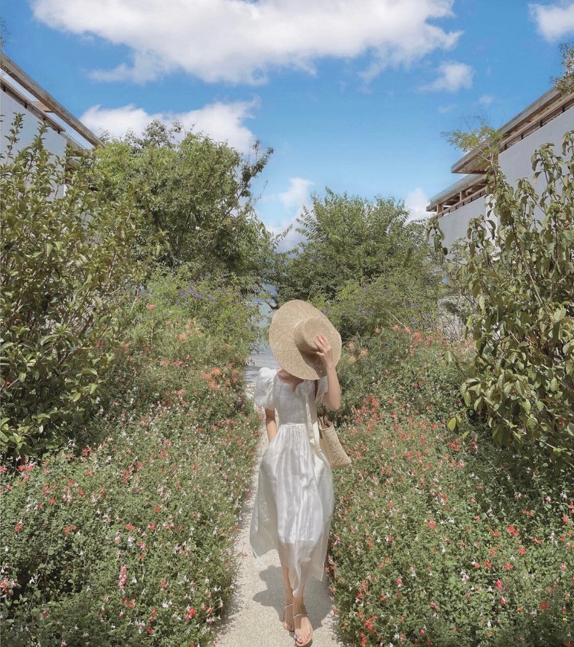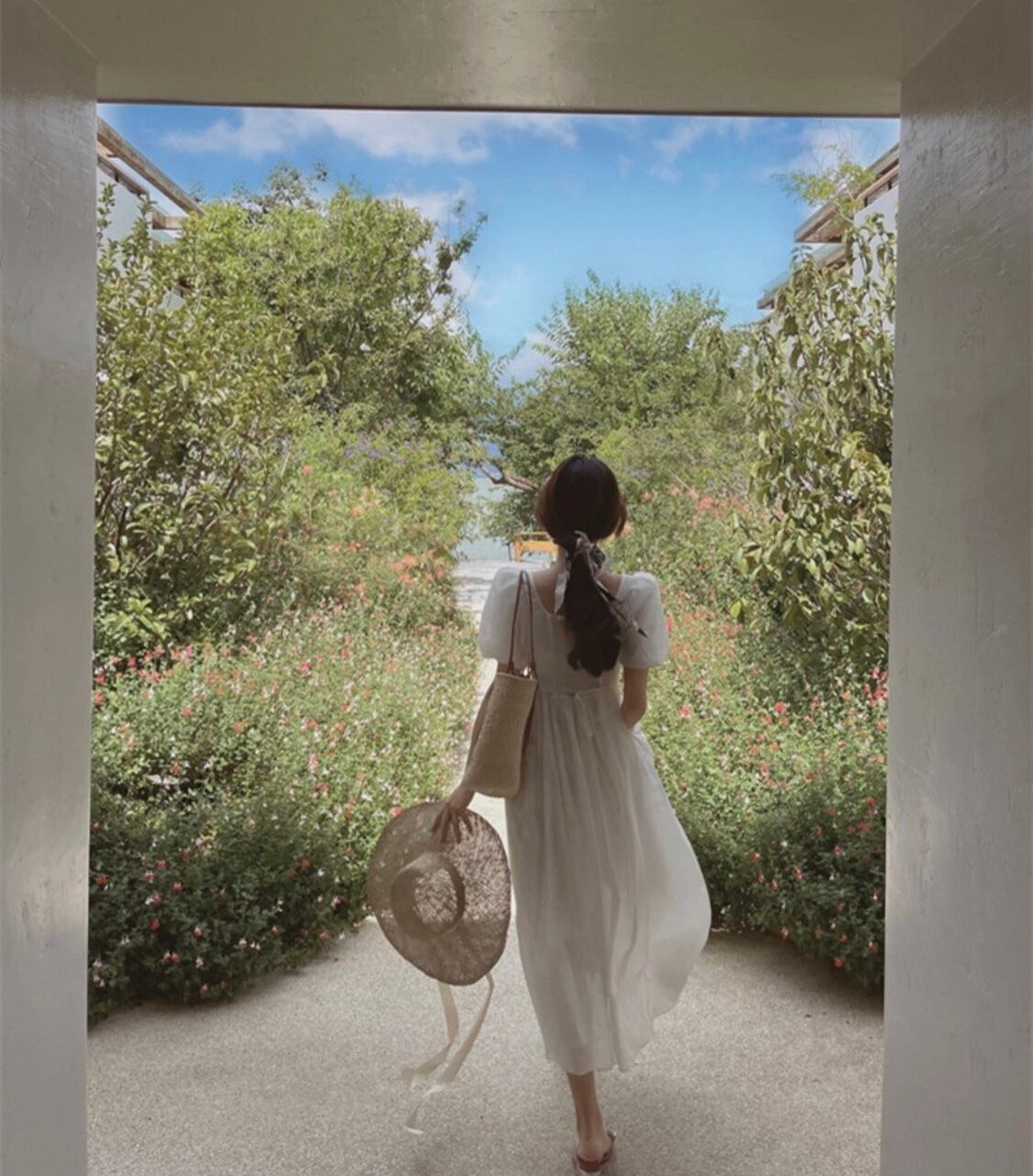 onepeace | ワンピース パフスリーブ 半袖 ミモレ丈 ハートライン 上品 フェミニン リゾート デザイン性