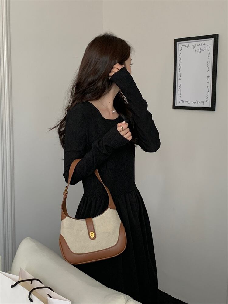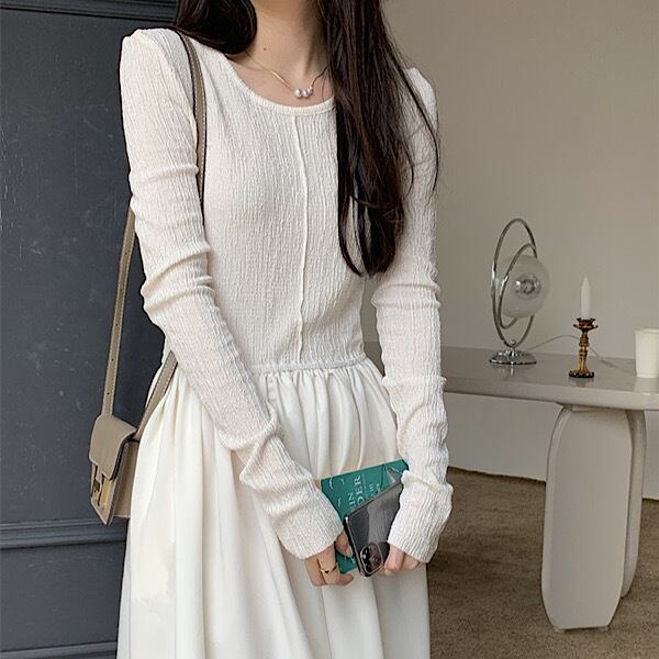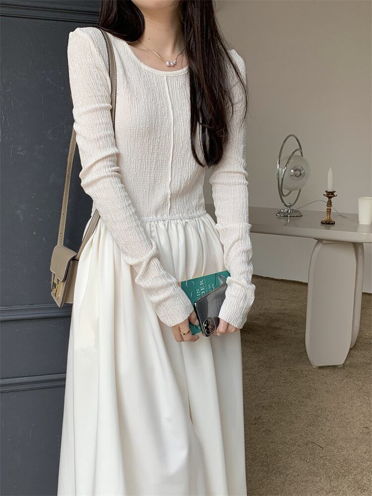 onepeace | ワンピース ロング丈 ラウンドネック 異素材 フレアワンピース ウエスト切替 ワントーンコーデ レディース
