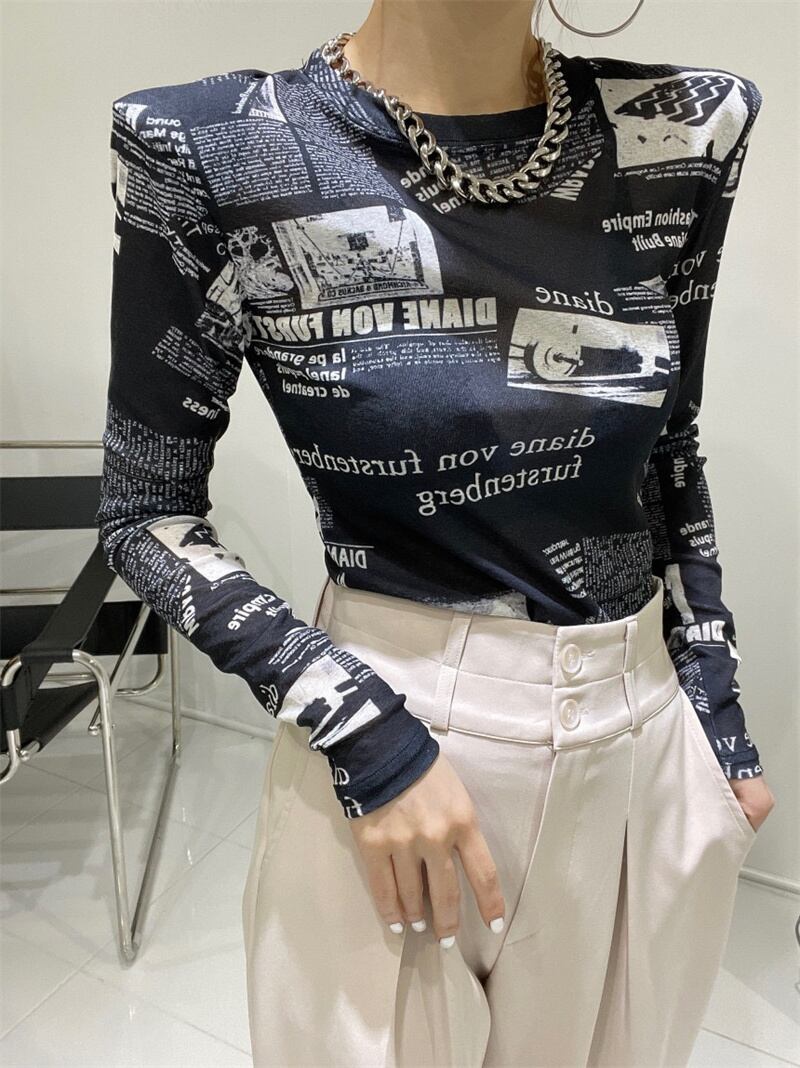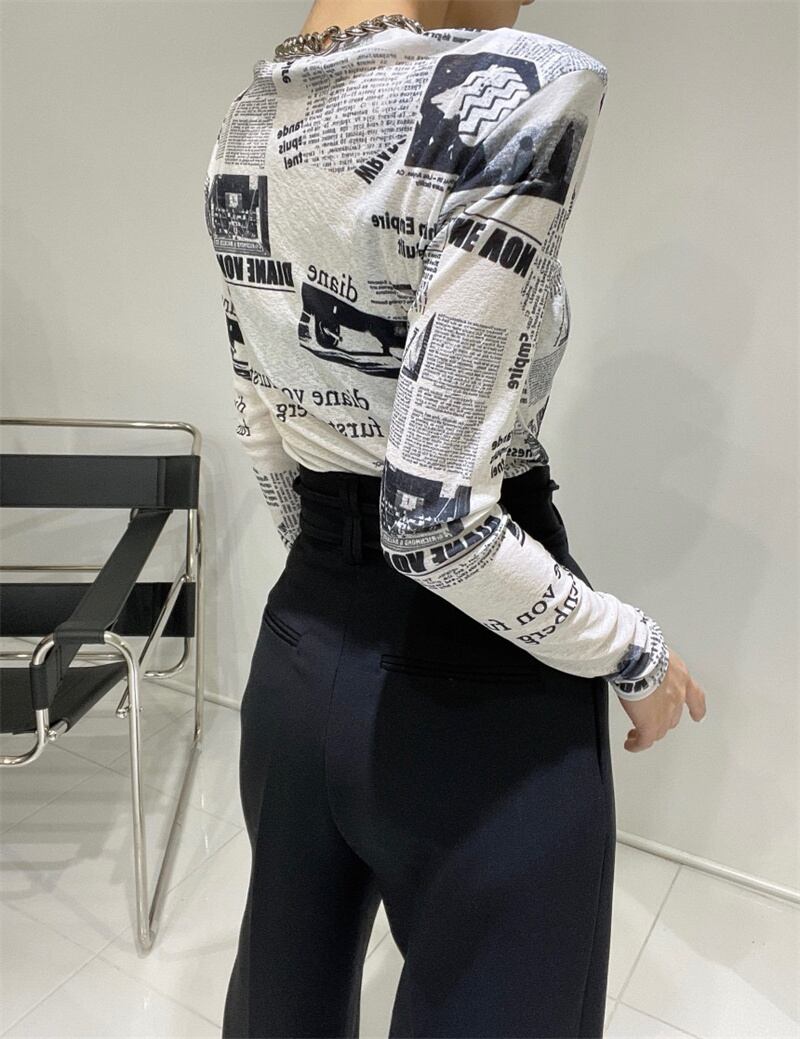 tops |トップス ブラウス ニュースペーパー プリント ラウンドネック 長袖 ユニーク スリム レディース