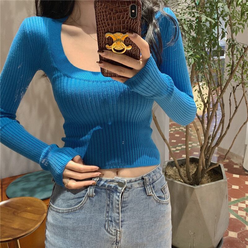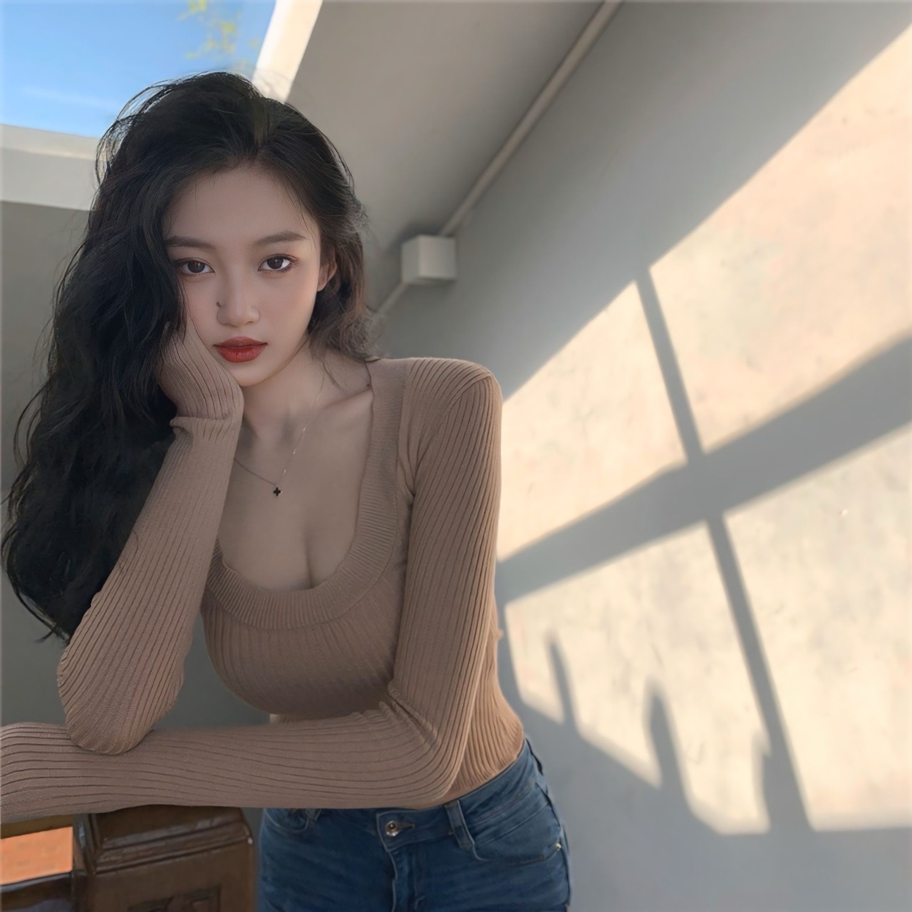 knit | トップス ニット Uネック 長袖 スリム リブニット セクシー 韓国ファッション ベーシック