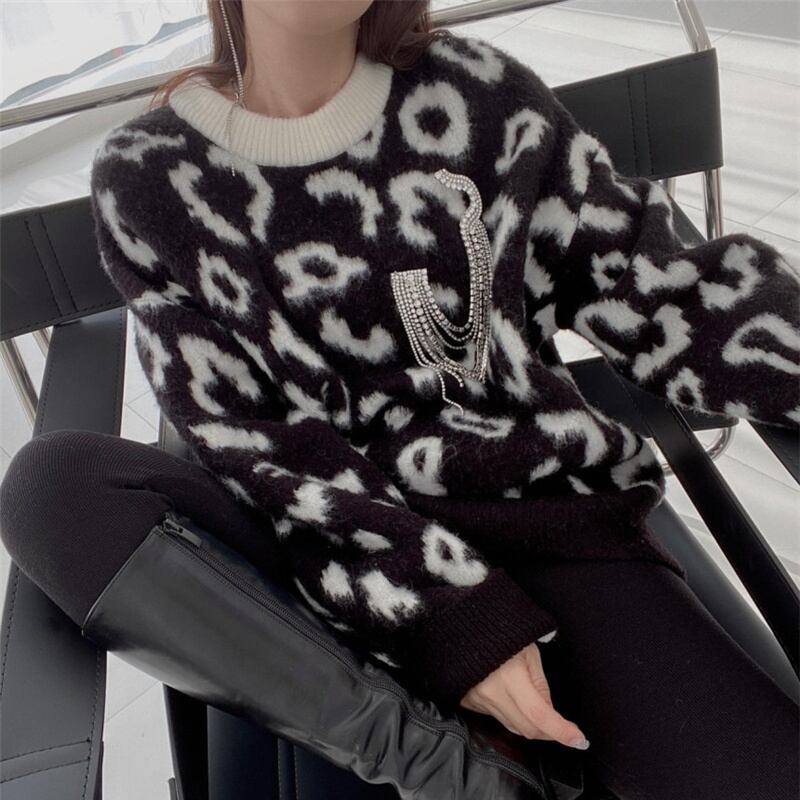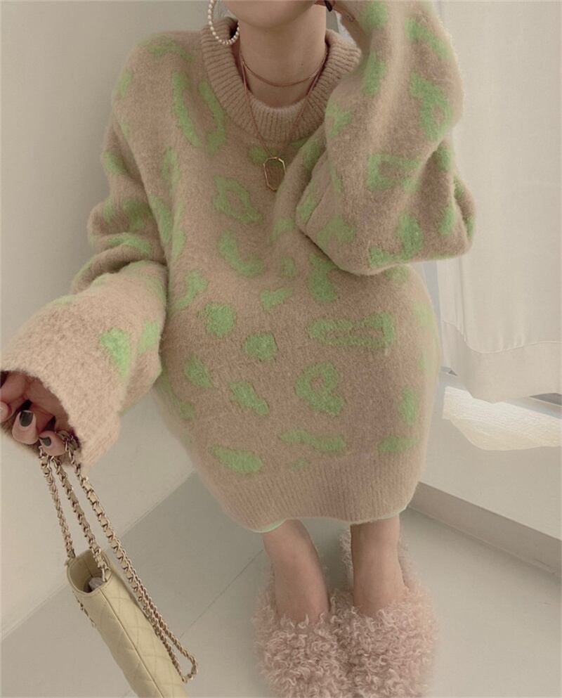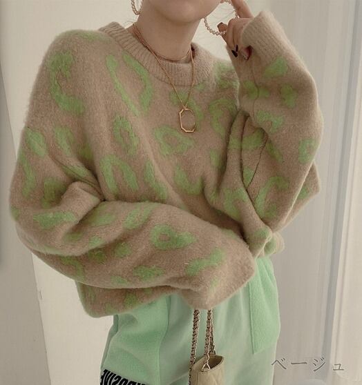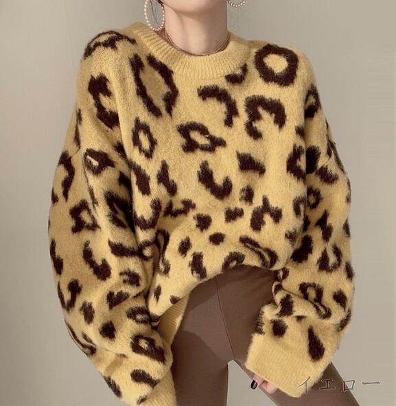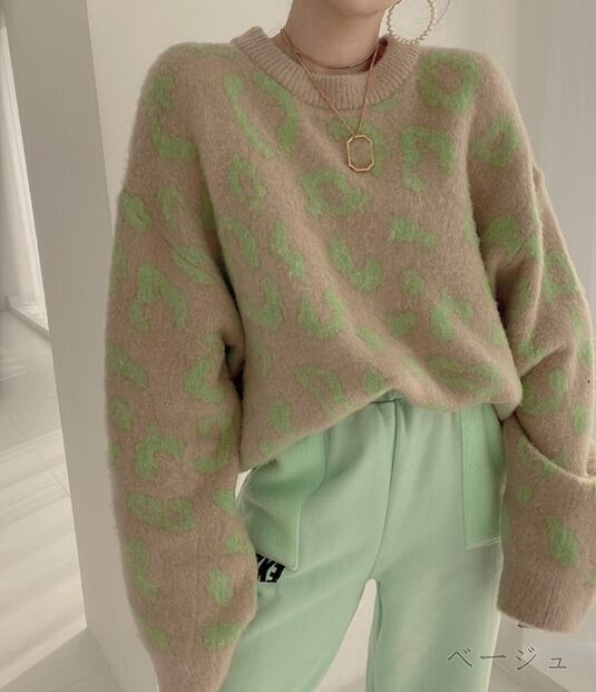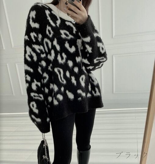 tops | トップス ニット レオパード クルーネック 厚手 長袖 レトロ プルオーバー