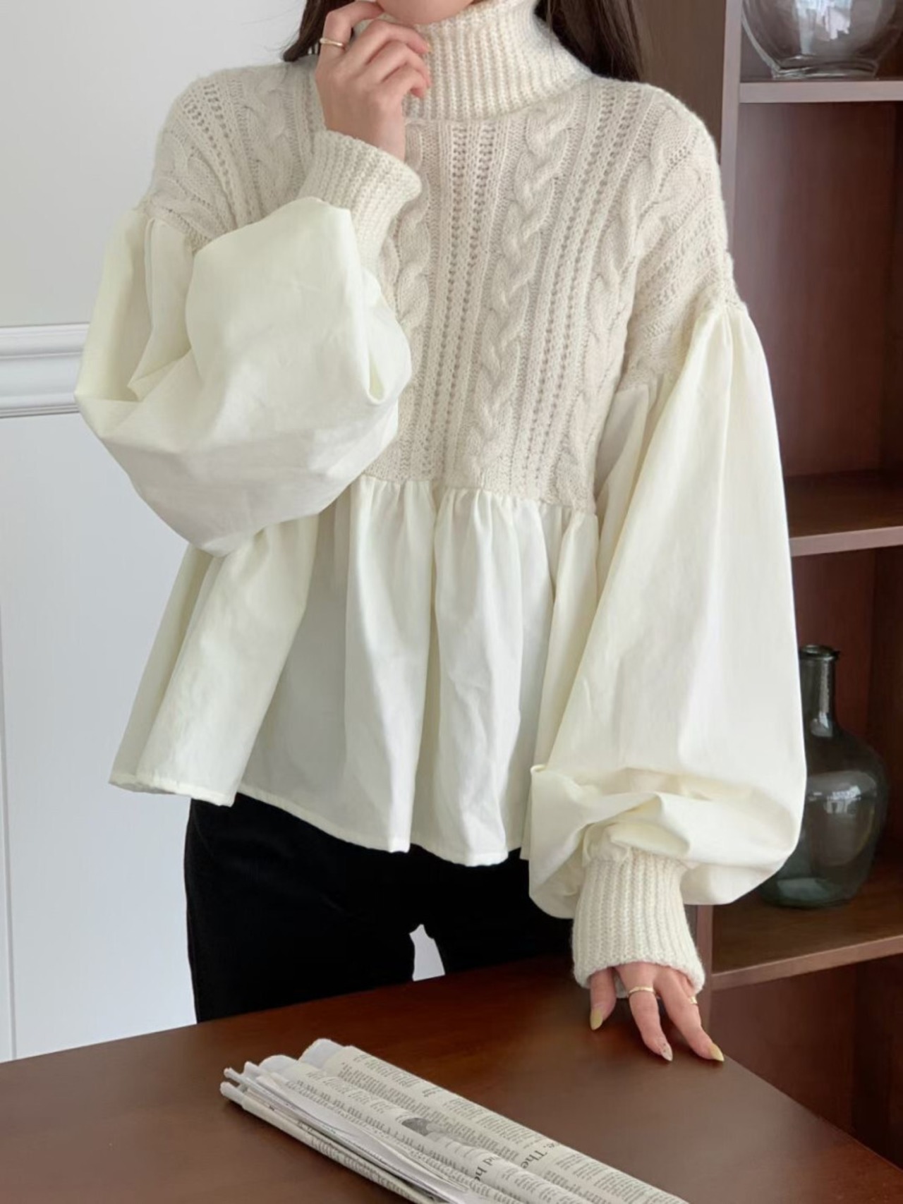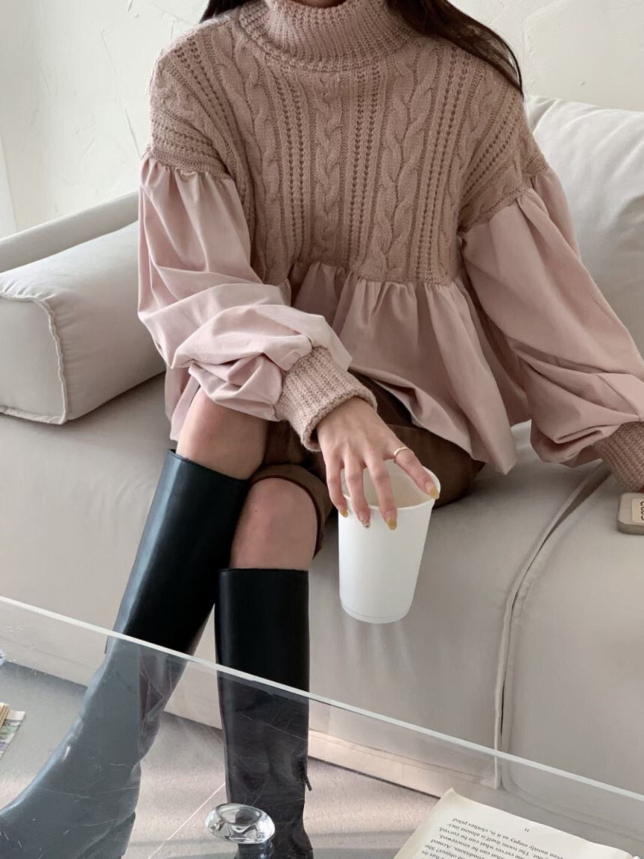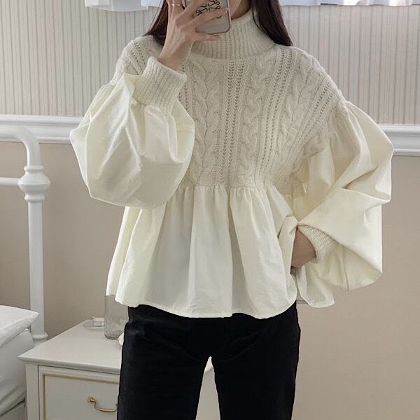 knit | ニット トップス 裾フリル 長袖 ハイネック ケーブル INSスタイル フェミニン 韓国