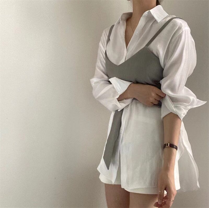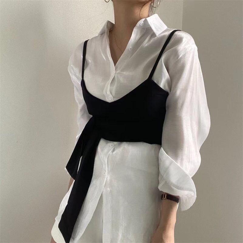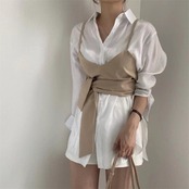 レイヤード風デザインで体型をカバーしてくれるシャツとキャミソールがセットされています。モダンでスタイリッシュな着こなしを叶えます。また、ビスチェを付けつ事で、着痩せ効果が期待できるデザインで、華奢な印象を演出します。