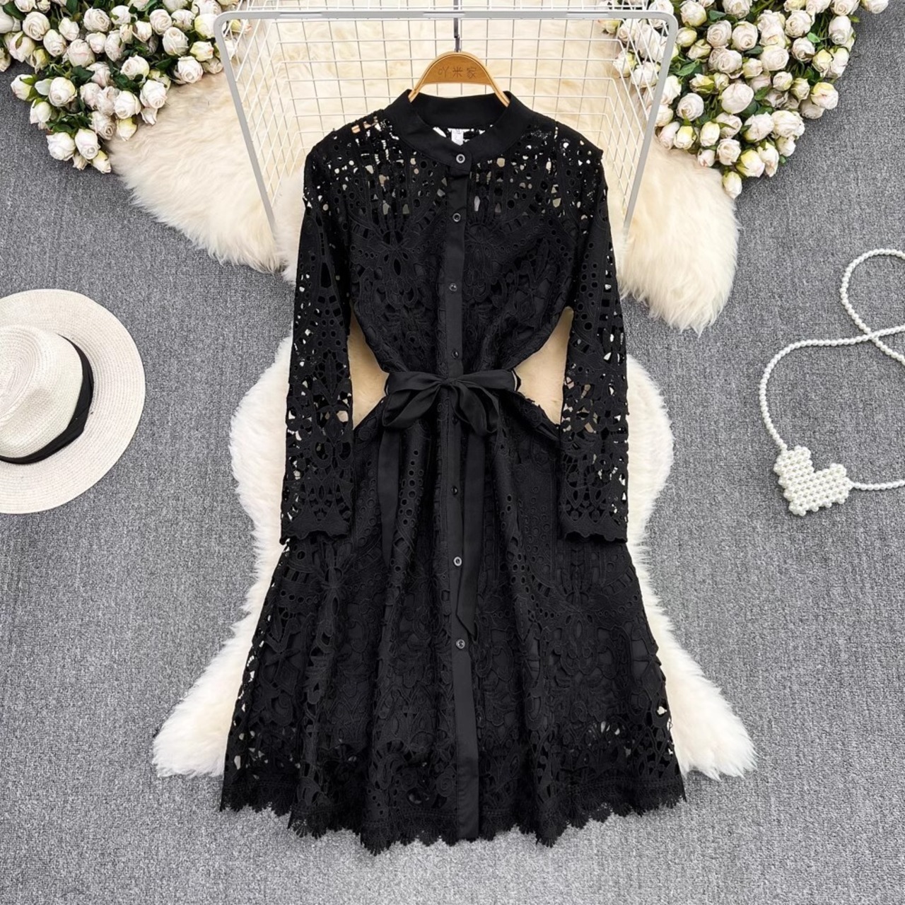 onepiece | ワンピース レース 透かし彫り エンブロイダリー ノーカラー 刺繍 フレアワンピース ウエストリボン 長袖 sweet 透け感