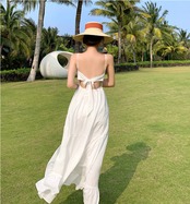 背中が美しく見えるリゾートワンピース。しっとりとした肌触りの素材で、涼しい風が心地よく通り抜けます。背中のデザインがポイントで、大胆な開き具合が女性らしさを引き立てます。