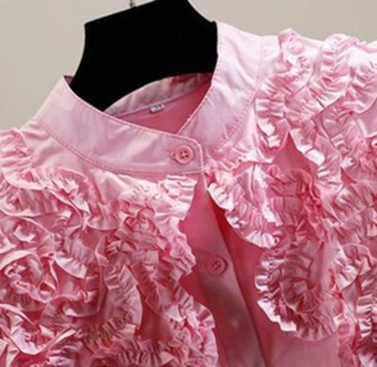 上品でユニークなデザインが魅力のトップス。ノーカラーシャツにフレンチスリーブが組み合わさったシンプルながらもエレガントな一枚です。フラワーモチーフの刺繍が施され、華やかな印象を与えます。柔らかなコットン素材で、肌触りも抜群です。