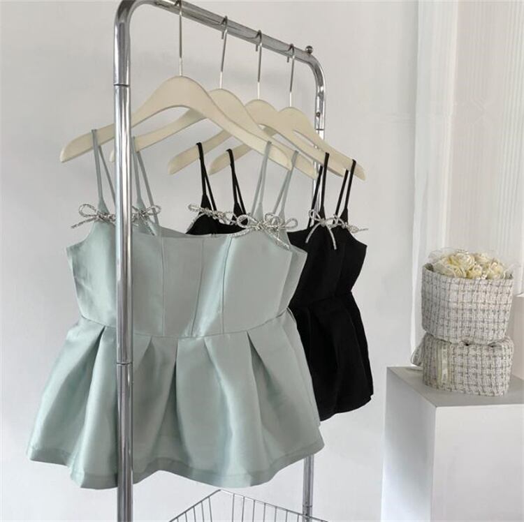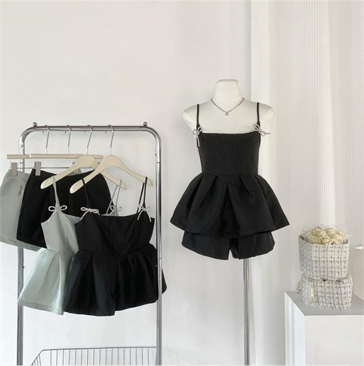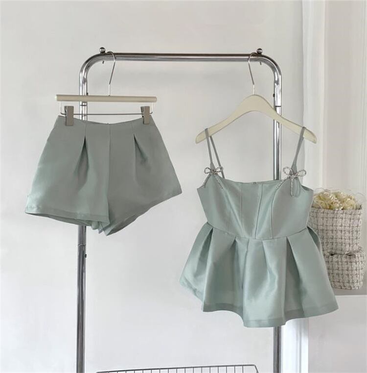 set up | セットアップ ペプラムトップス キャミソール ショートパンツ INSスタイル 光沢 レイヤード 韓国ファッション