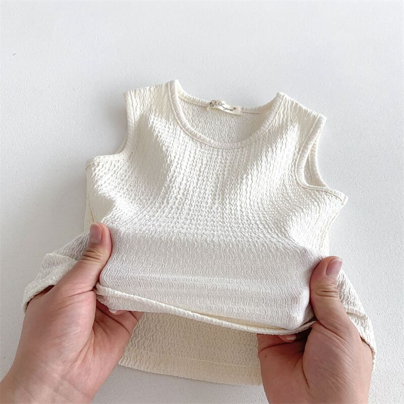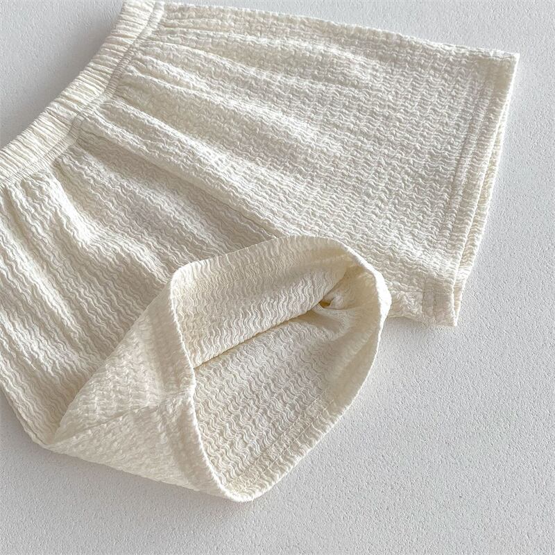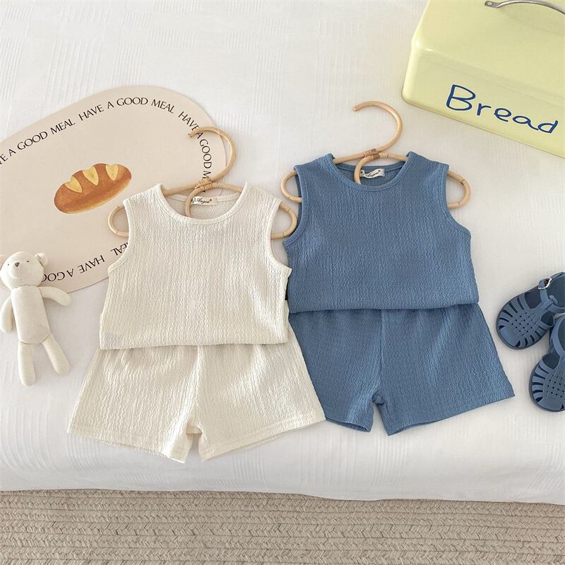 ユニセックスで使えるノースリーブトップスとショートパンツがセットになったアイテムです。シンプルな無地デザインなので、男の子も女の子も着やすい一着です。ウエストはゴム仕様で着替えも楽々◎