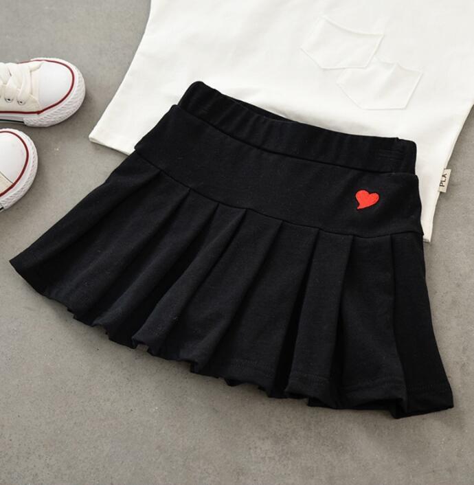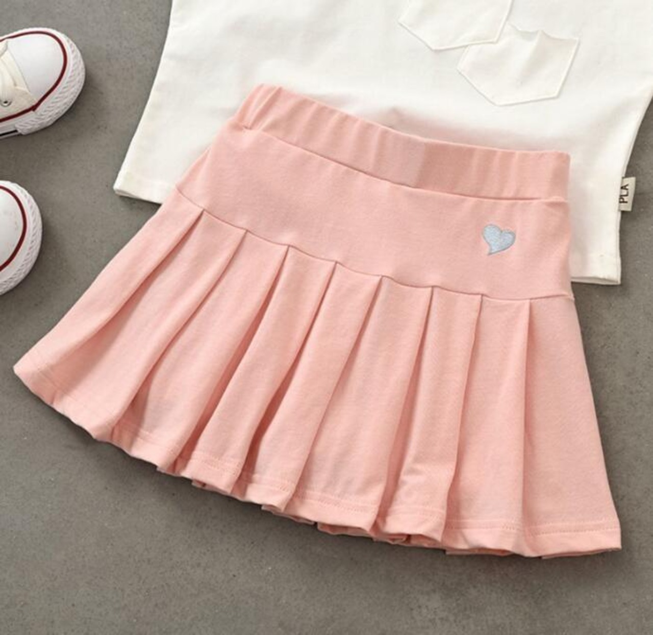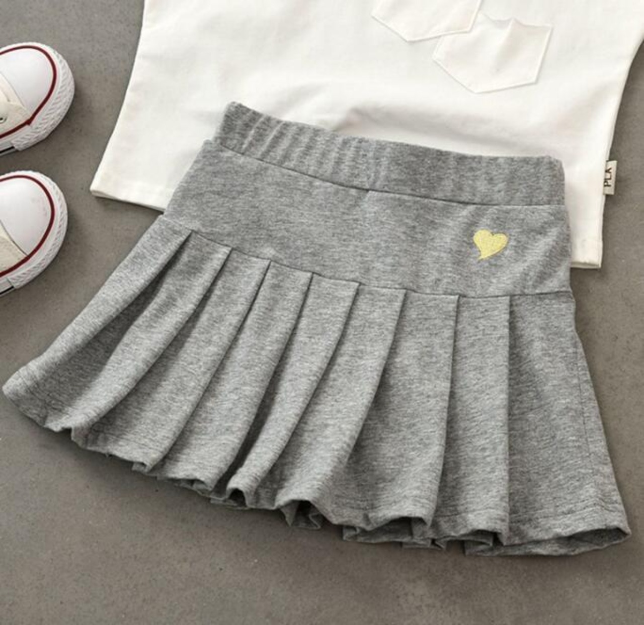ウエストゴム付きで着脱も簡単。台形のシルエットとプリーツデザインがおしゃれな一枚です。さらに、ワンポイントのハートデザインがアクセントになり、お子様のコーディネートをグッと華やかにしてくれます。