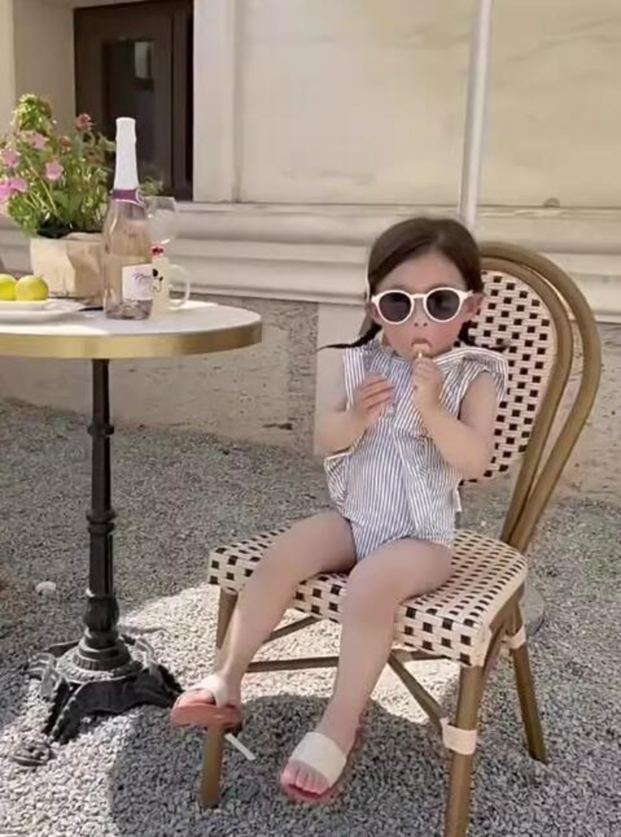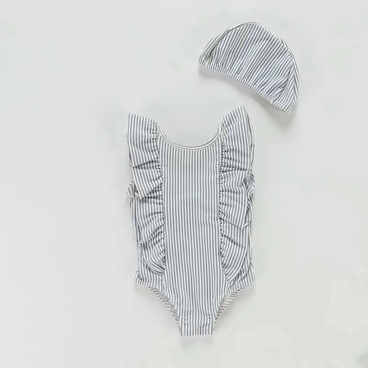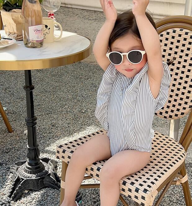 バックレスデザインとショルダーフリルが女の子らしい可愛さを引き立てます。CHICなストライプ柄がお子様のスイミングタイムを楽しく彩ります。