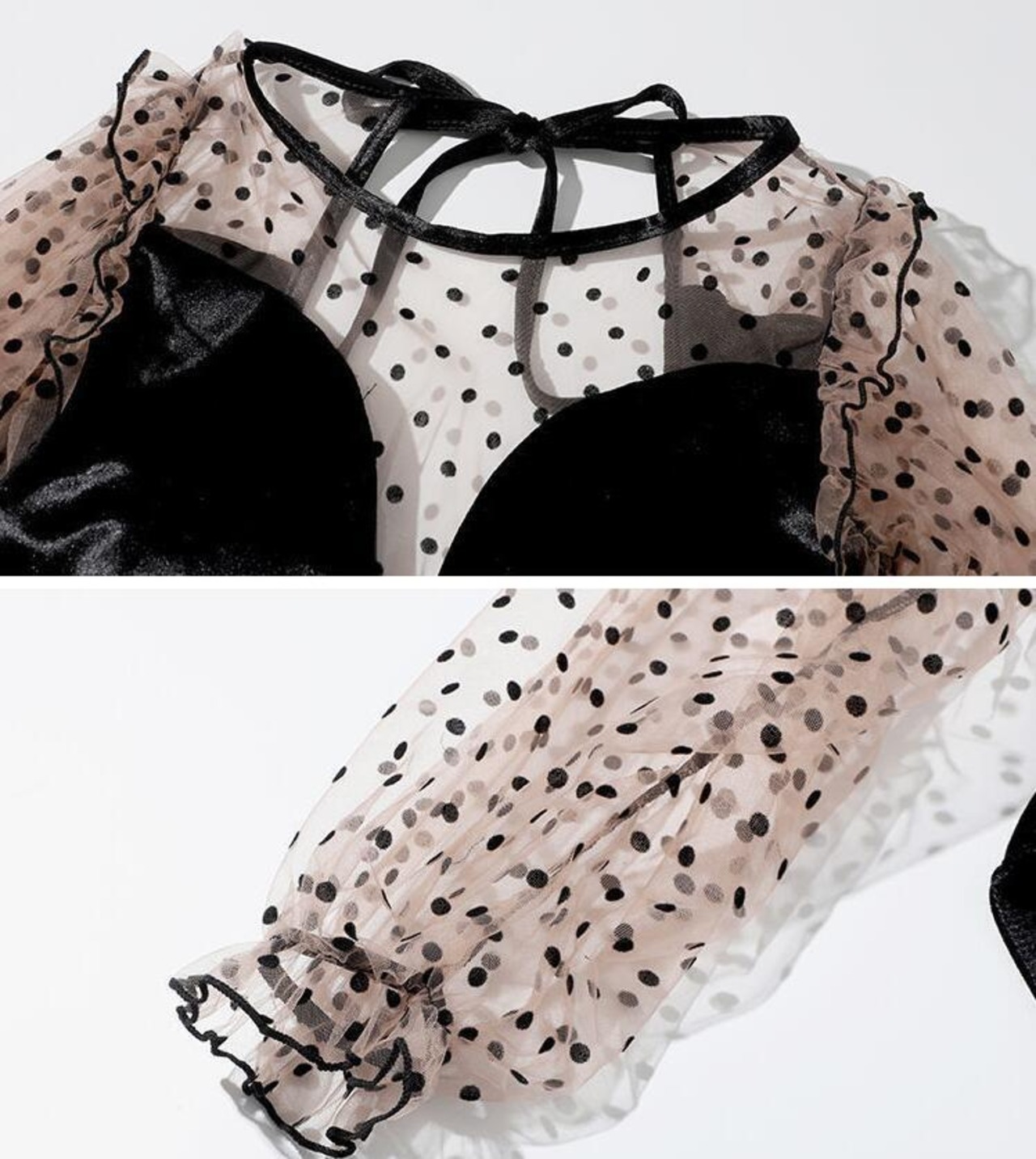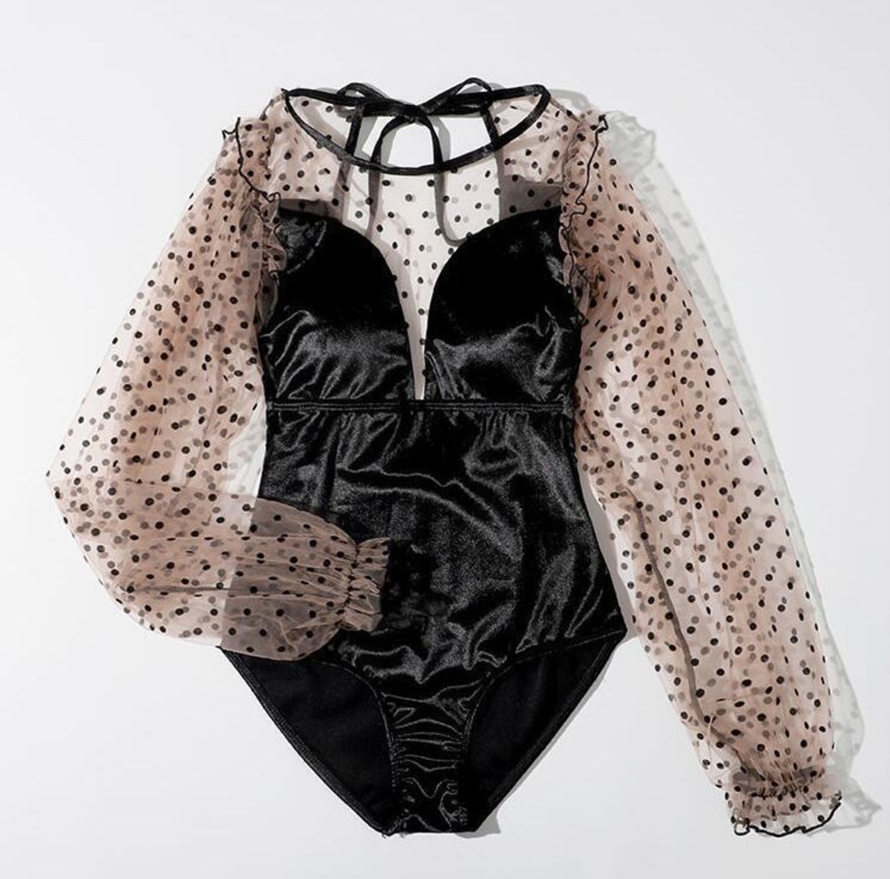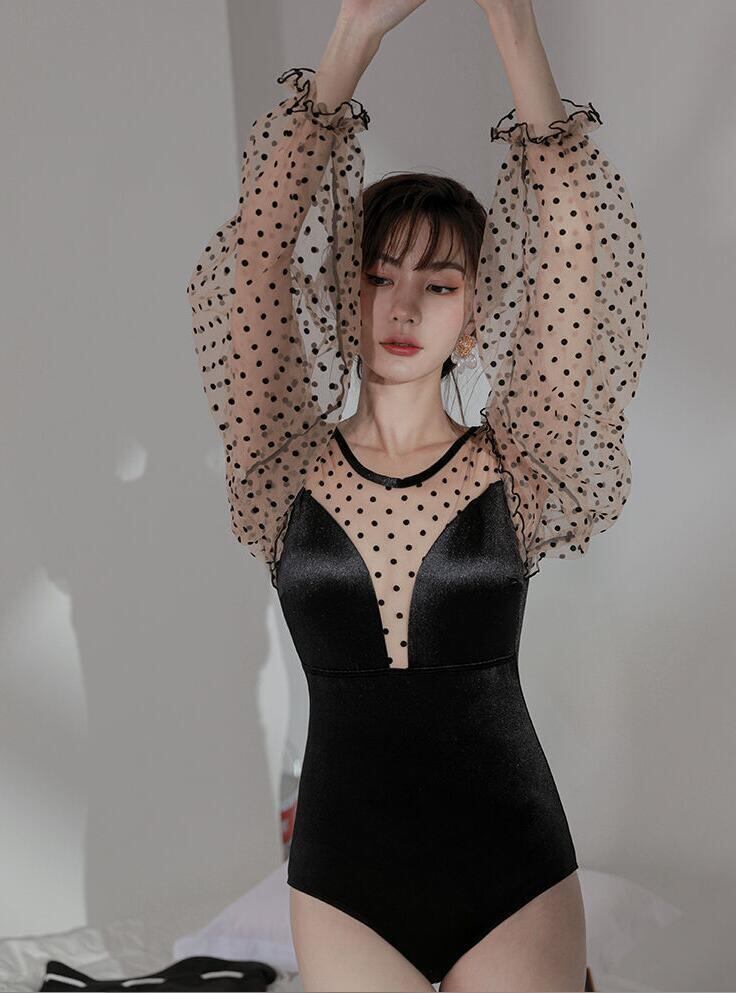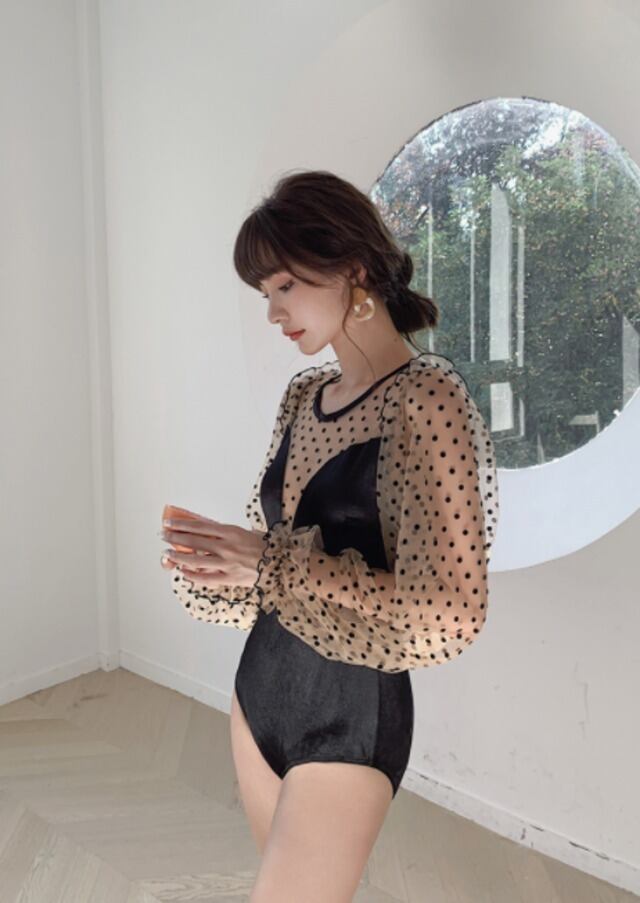 swimsuit | 水着 ワンピース レトロ シースルー 長袖 ドット柄 体型カバー バックオープン リゾート 海 プール