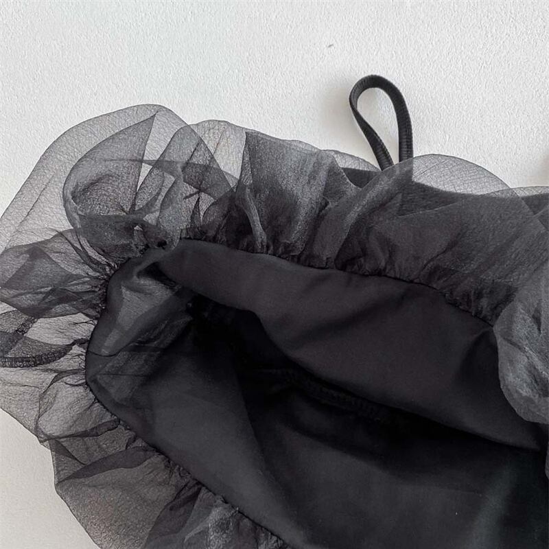 肌触りの良い子供服。透け感とシースルー素材がおしゃれなブラックコーデを演出します。伸縮性のある素材で、お子様の動きを邪魔せず快適な着心地を提供。夏の暑い日も涼しく過ごせる一着です。