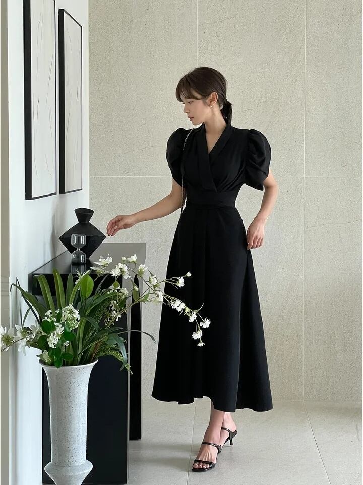 パフスリーブが華やかな印象を演出し、ウエスト部分のシャープなデザインがメリハリのあるシルエットを作ります。Vカットやカシュクールなどの細部にまでこだわったデザインは、女性らしさを引き立ててくれること間違いなしです。