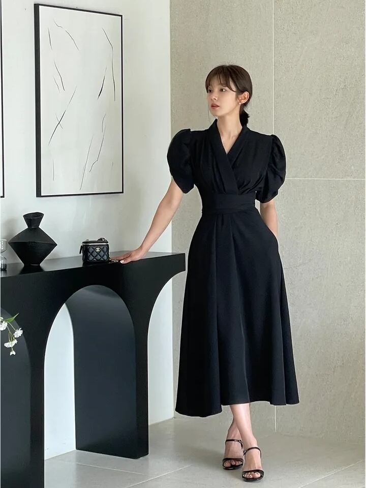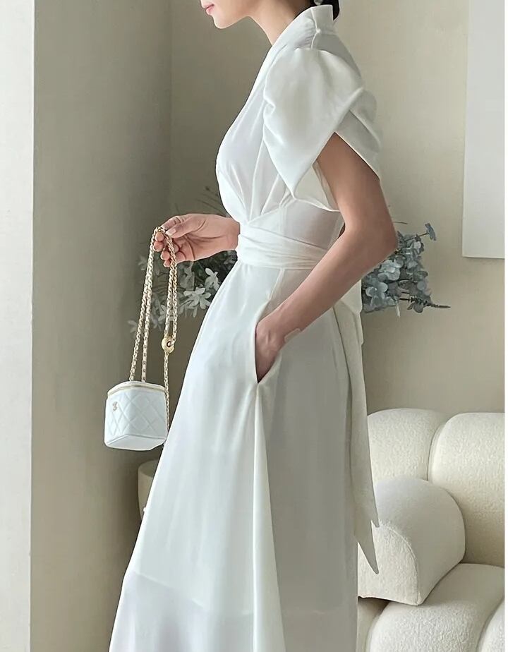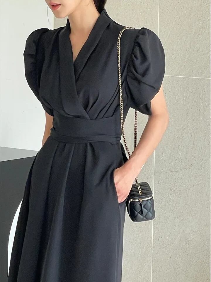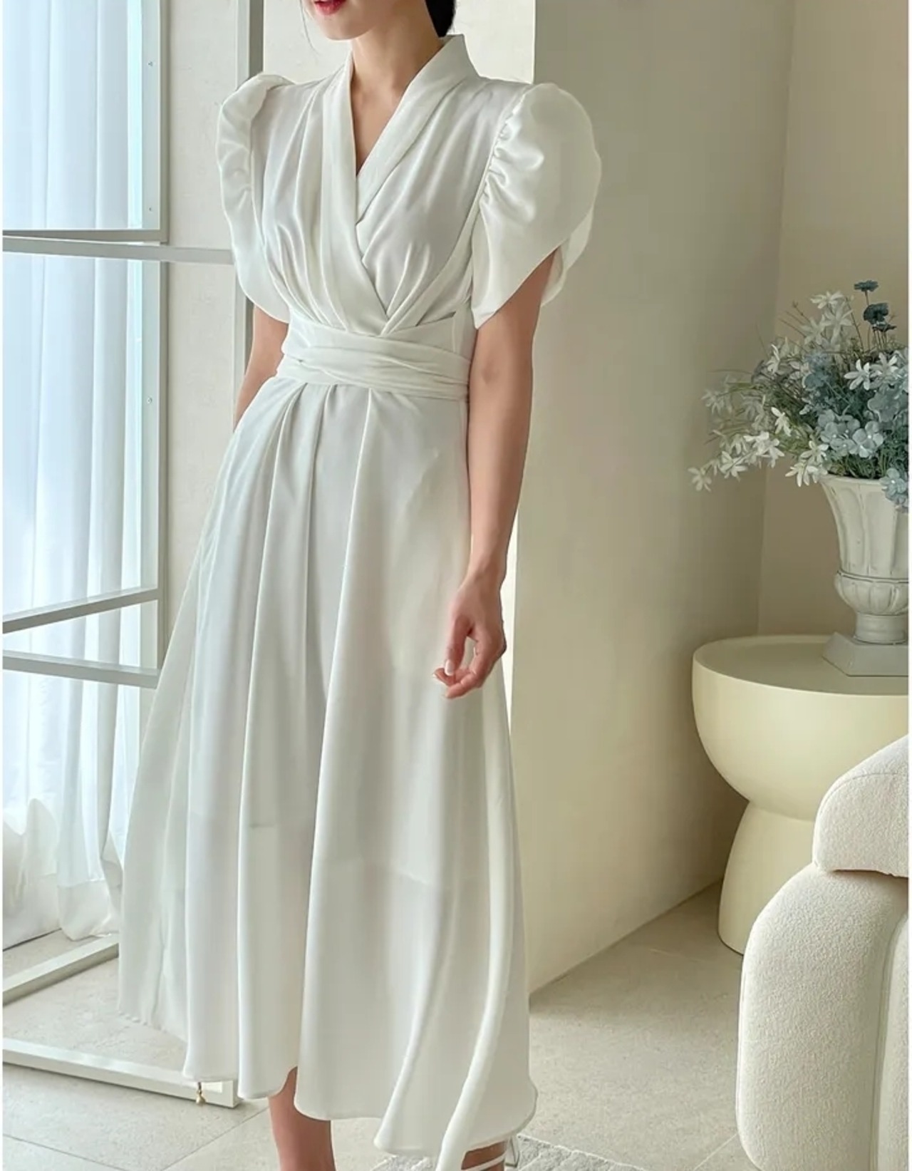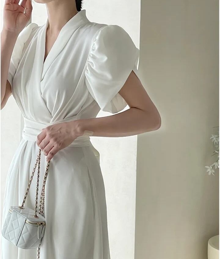 onepiece | ワンピース パフスリーブ ウエストシャープ ロングワンピース Vカット カシュクール