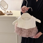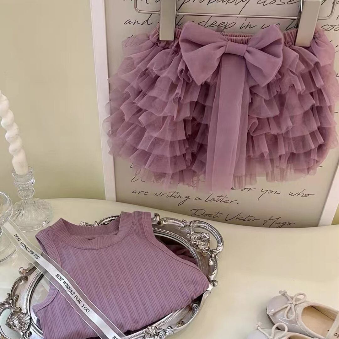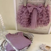 ノースリーブのトップスとティアードスカートの2点セットで、ウエストリボンがアクセントになっています。さらに、トップスとスカートのコーディネートが簡単なので、忙しい朝でも着せ替えがスムーズです。