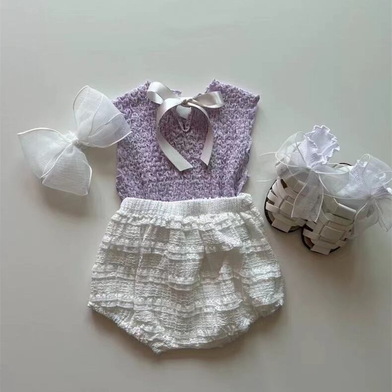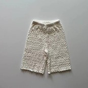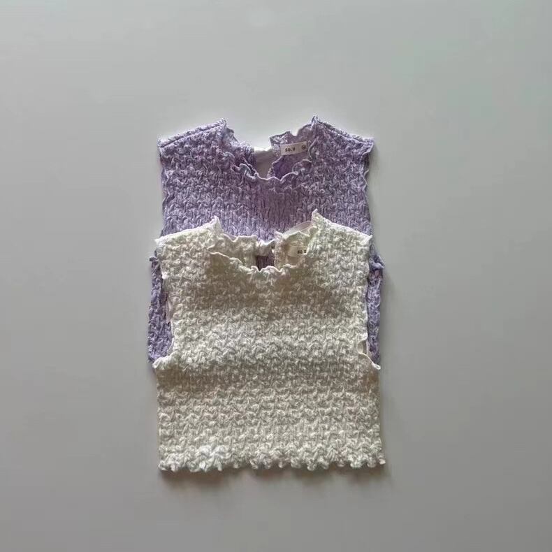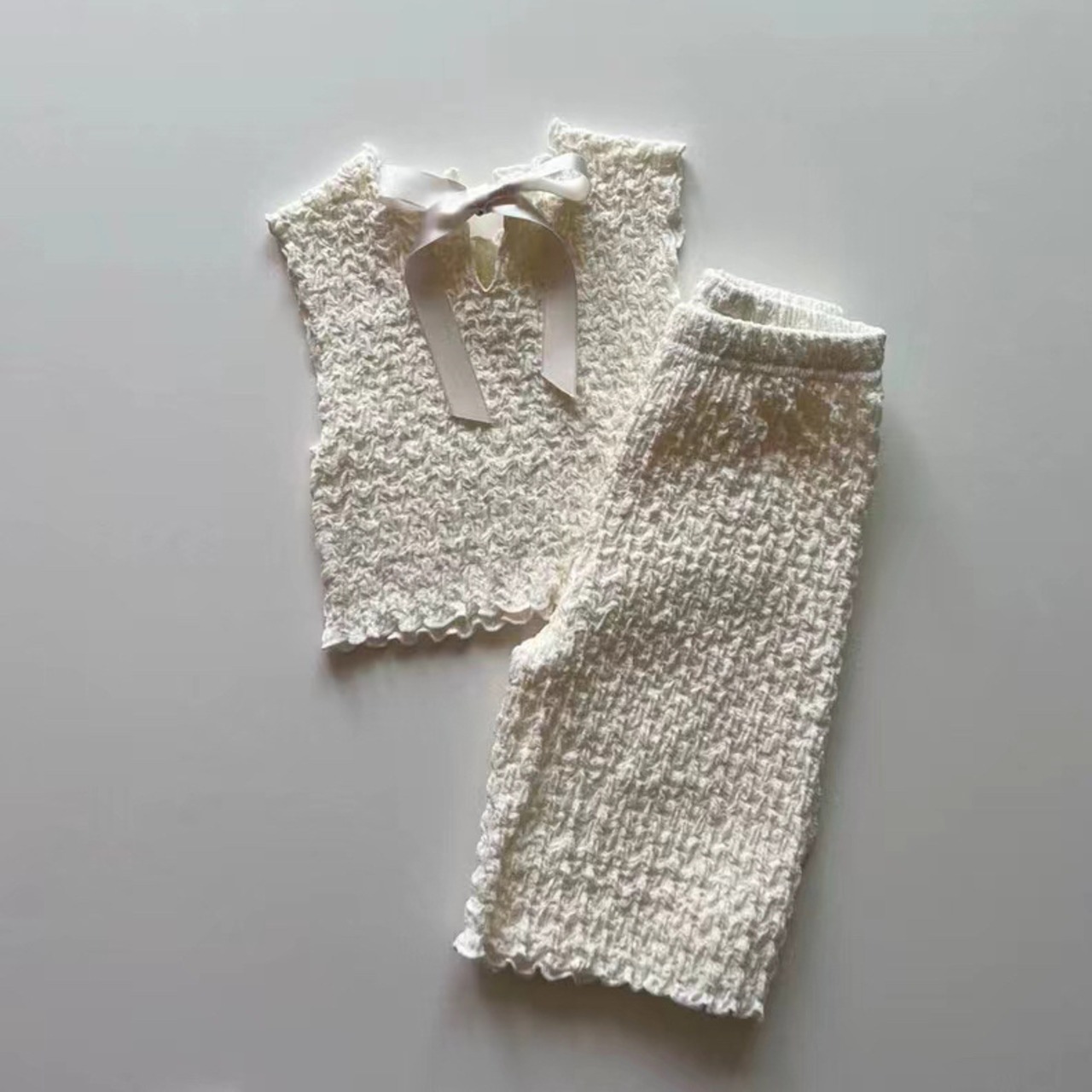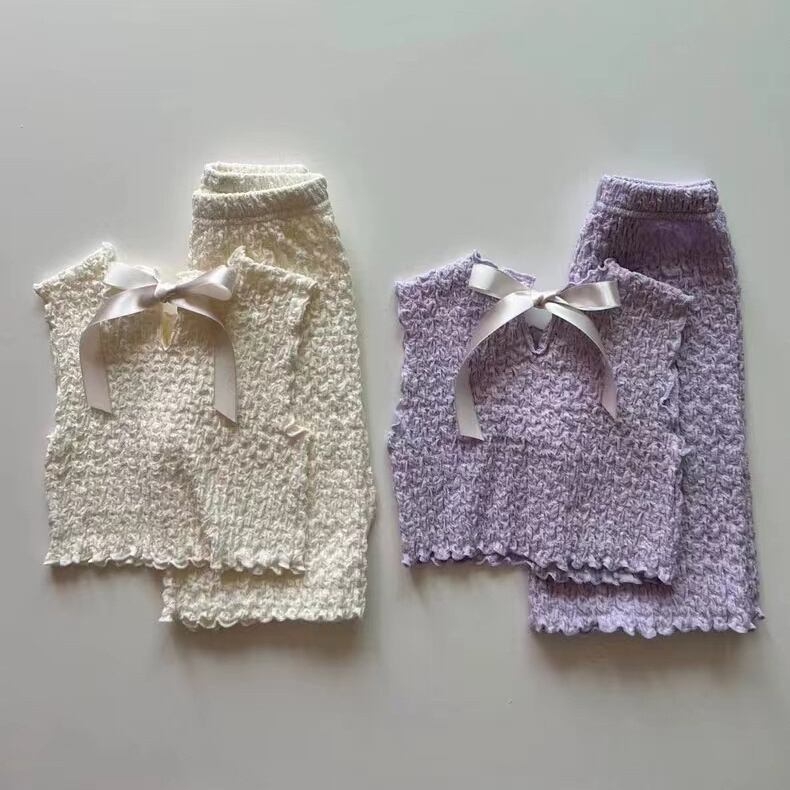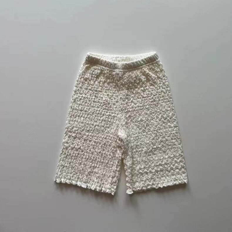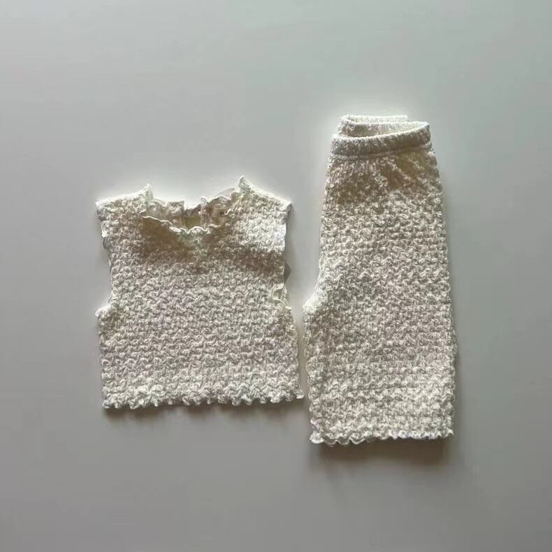 ノースリーブのトップスと七分丈のワイドパンツの2点セット。しわ加工が施されたデザインで、おしゃれなお子様にぴったりのアイテム。