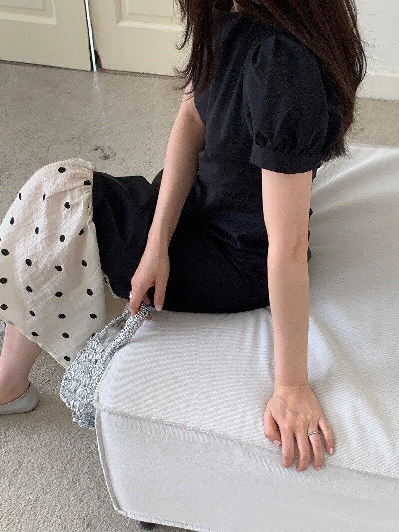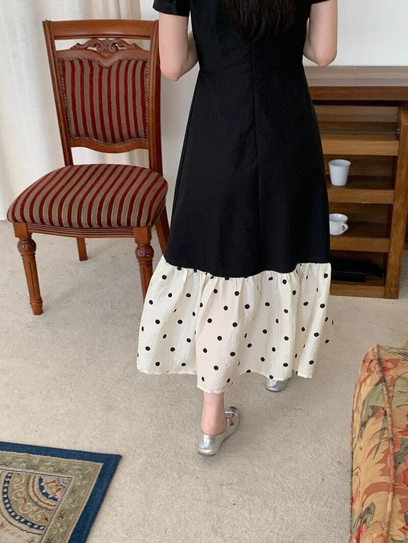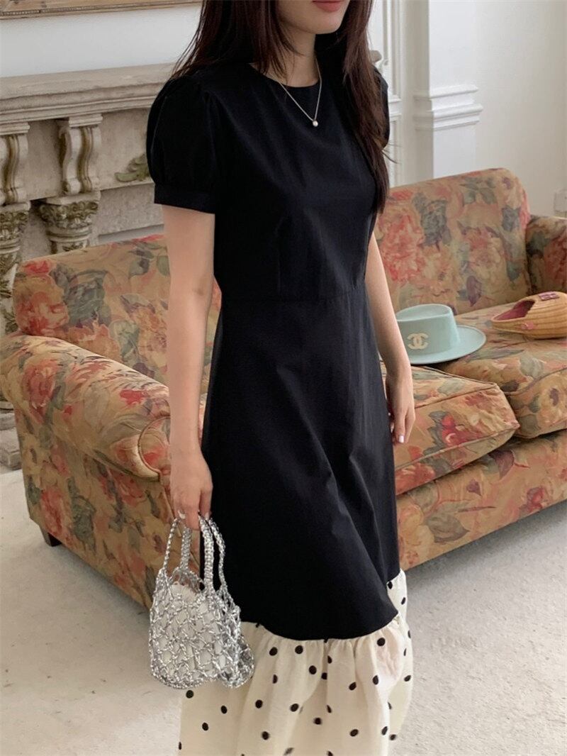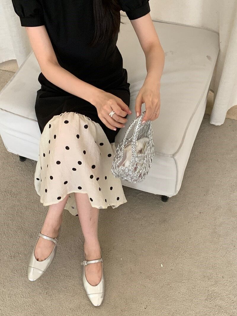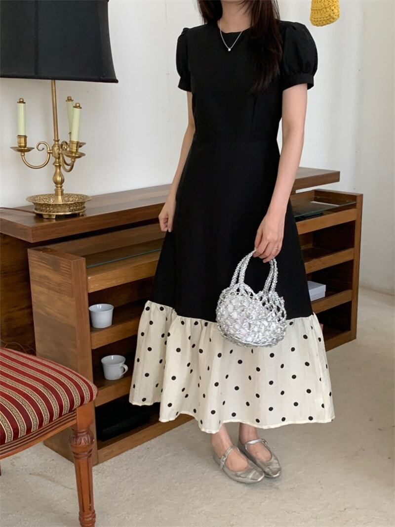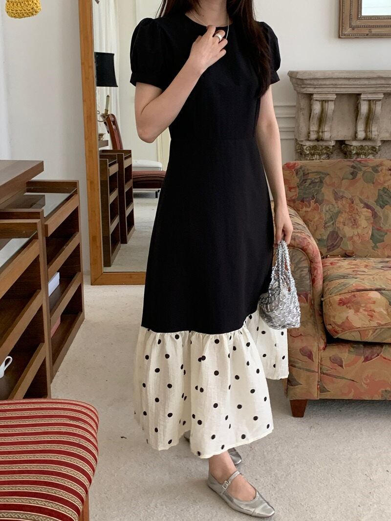onepiece | ワンピース パフスリーブ 裾フレア ドット柄 半袖 ミモレ丈 体型カバー レトロ