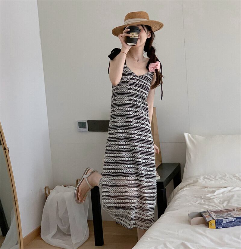 ノースリーブで夏にぴったりの涼しげな着こなしを叶えます。ショルダーリボンがアクセントになっているVカットデザインで、女性らしい上品さも演出。ロング丈でスタイルアップ効果も抜群です。さらに、程よいボーダーデザインがおしゃれ感をプラス。シンプルながらもこだわりの詰まった一枚です。