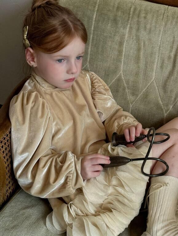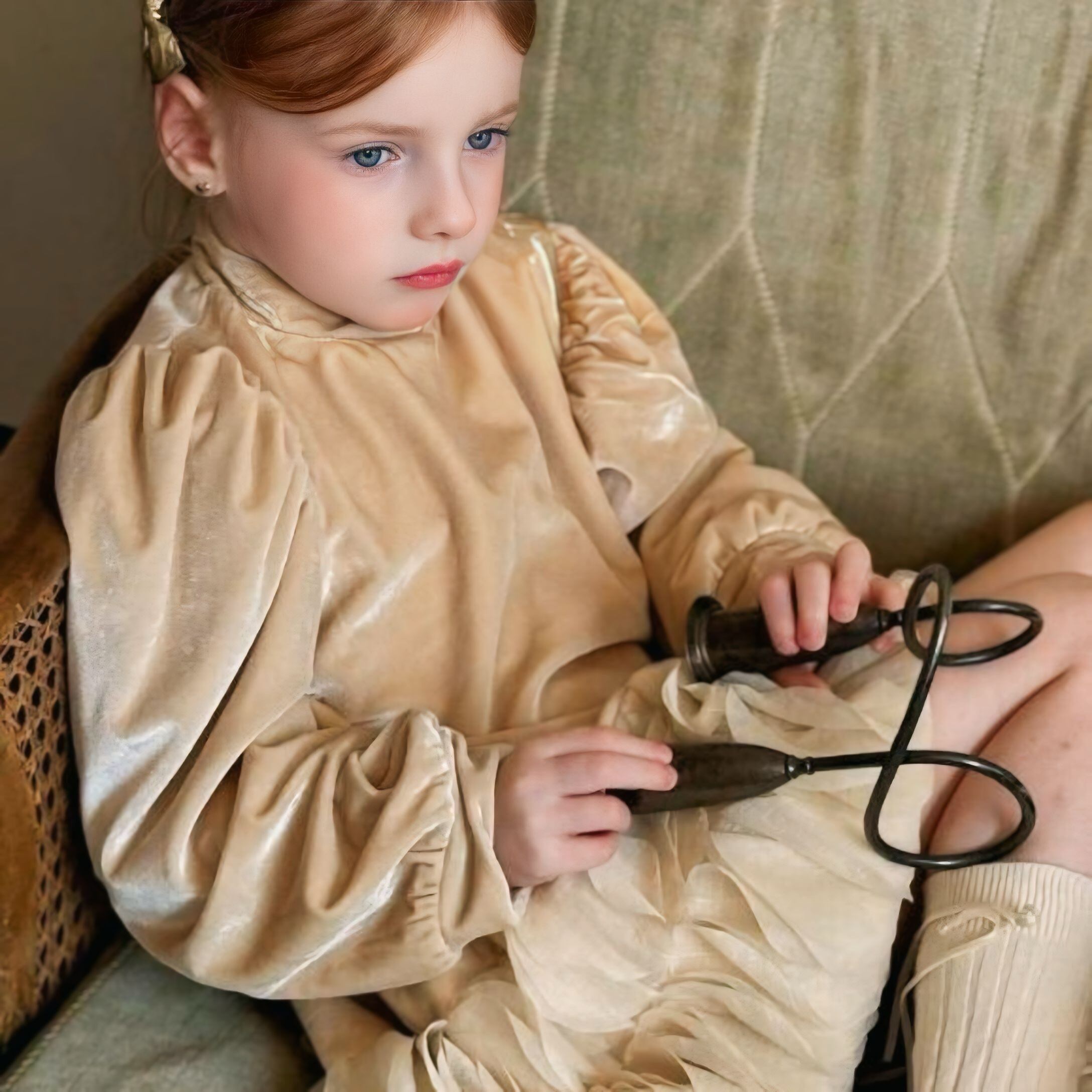 高級感あふれるAnelaの子供服KIDSシリーズのベロアワンピース。ハイネックと裾のボリュームがおしゃれで、Aラインのシルエットが女の子らしさを引き立てます。上質なベロア素材で着心地も抜群。