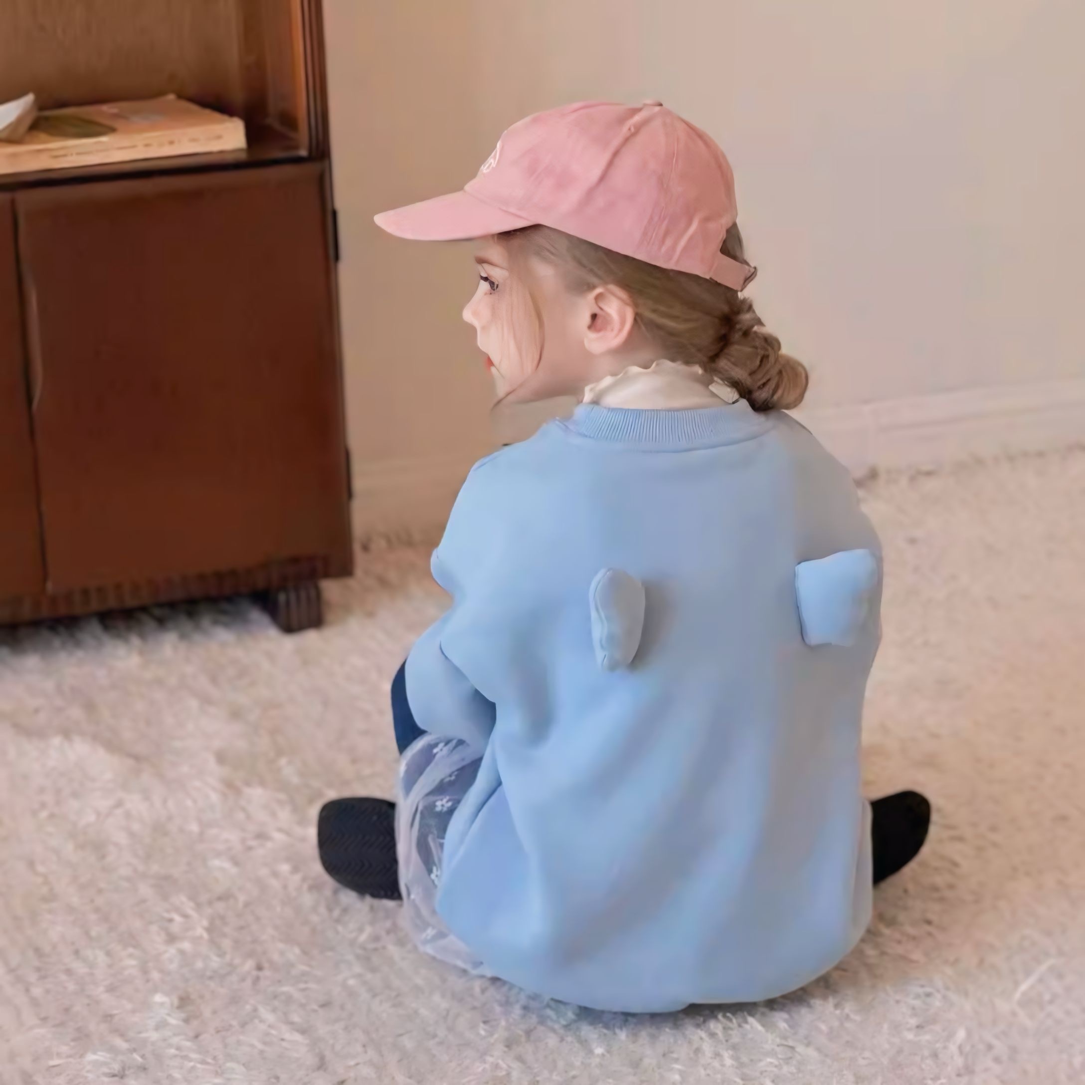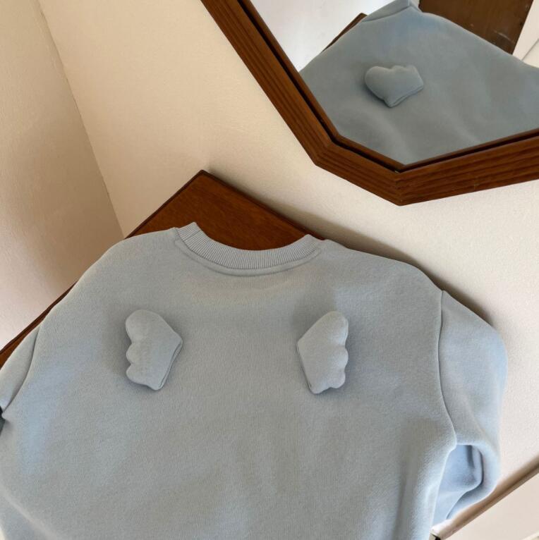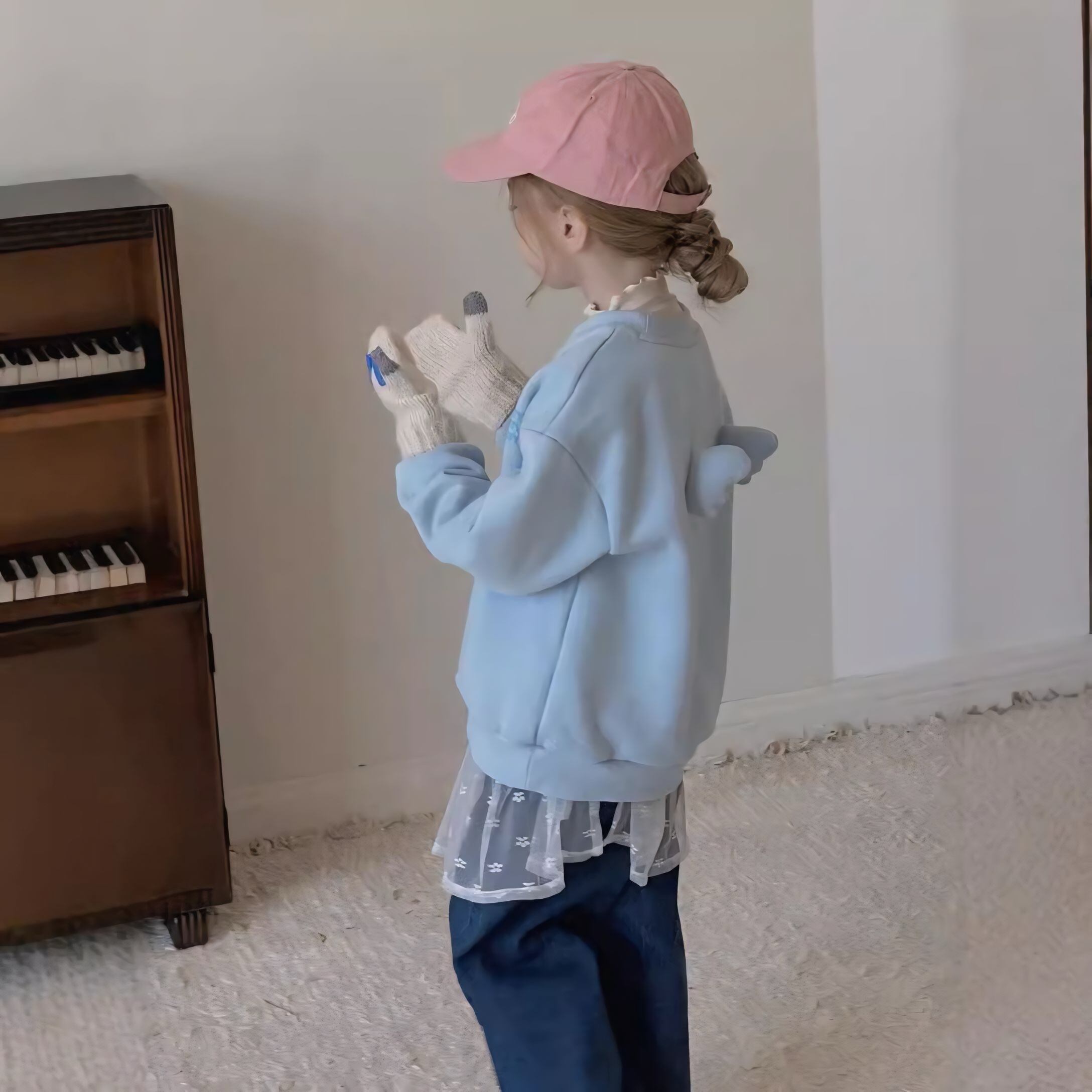 Anela 子供服の暖かいトレーナー。裏起毛でふわふわな素材感と、キュートな羽付きデザインが特徴。パステルブルーのシンプルな色味はどんなコーディネートにも合わせやすく、お子様も喜んで着てくれること間違いなし◎