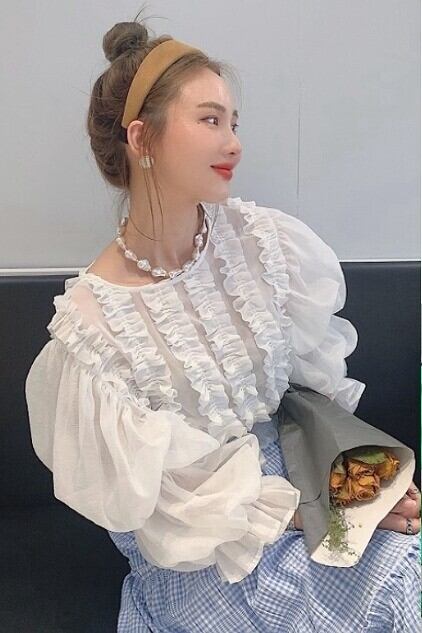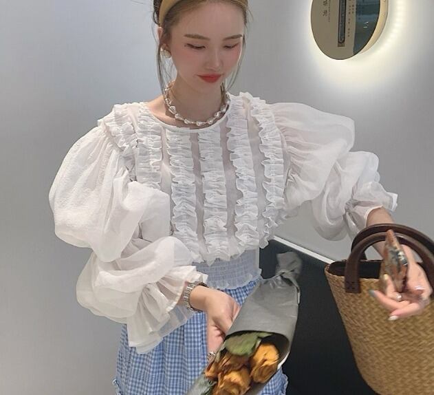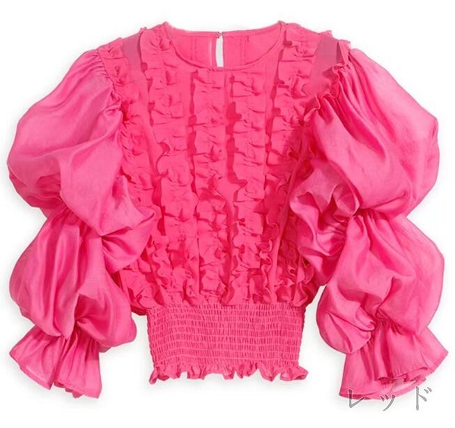 トレンド感たっぷりのボリュームスリーブとフリルディテールが、華やかな印象を与える一枚です。ウエストシャープで女性らしいシルエットを演出し、ラウンドネックで上品な印象を与えます。