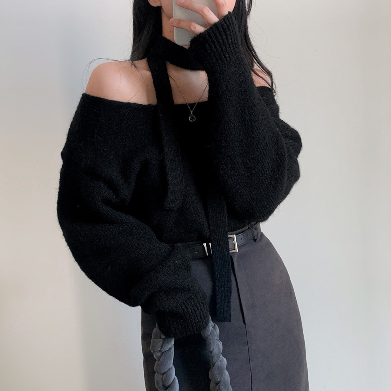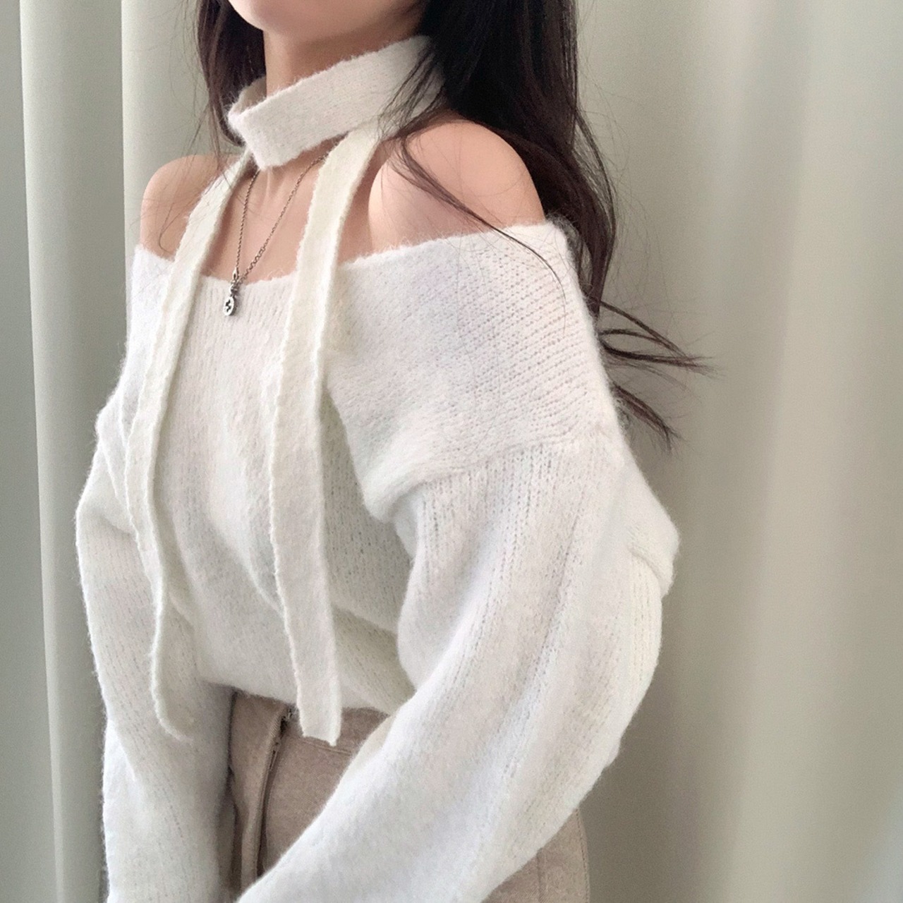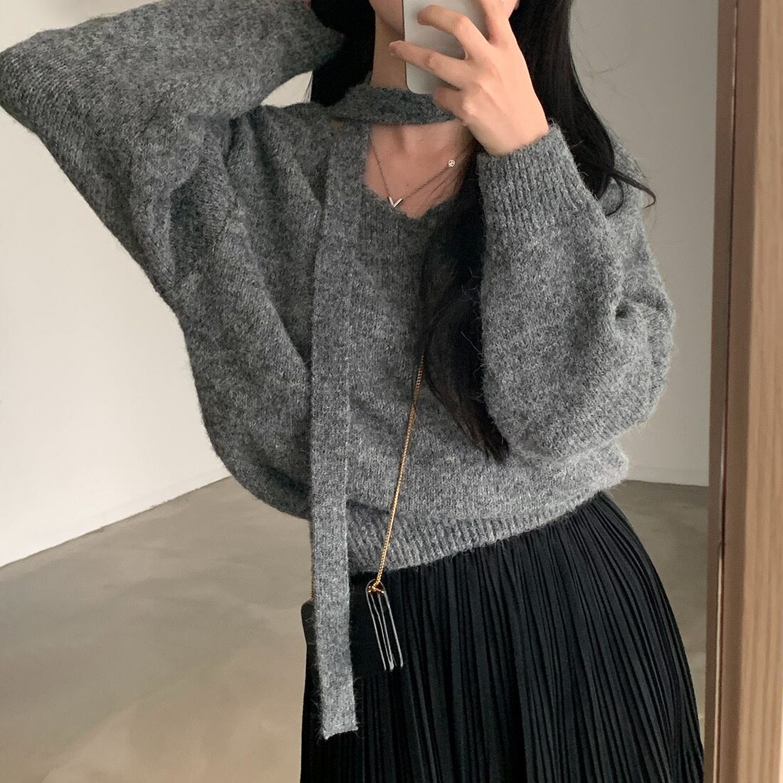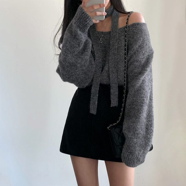 tops | トップス ボウタイ Vネック 長袖 ニット 秋冬 セーター ドロップショルダー
