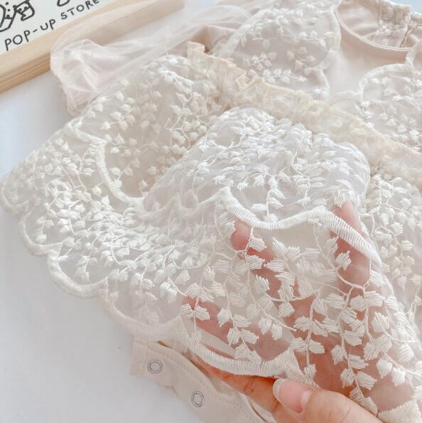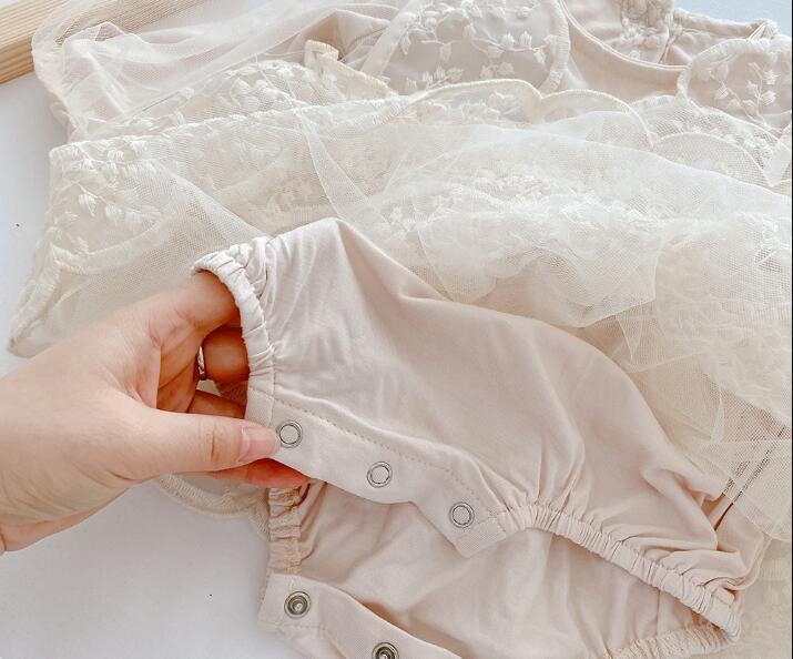 チュールと可愛らしい刺繍が施された女の子向けのベビーロンパース。軽やかな素材で、赤ちゃんのデリケートな肌にも優しい一着。レースが施された袖口や襟元が、さりげなくおしゃれさを演出してくれます。
