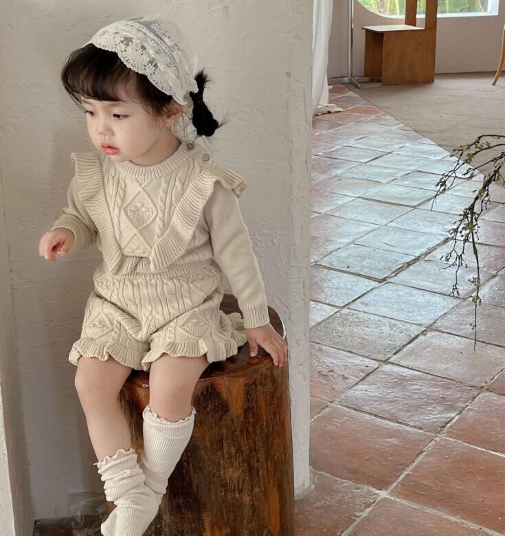 kids | 子供服 赤ちゃん服 セットアップ ケーブルニット ショルダーフリル ショートパンツ 裾フリル